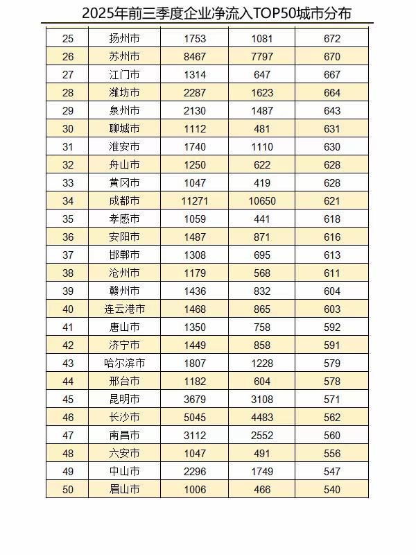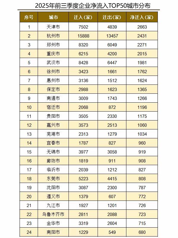 2025年前三季度企业迁移和净流入数据 2025年前三季度,全国跨省市企业迁入430501家,迁出359303家,较上年同期均有所上升。 从省份分布来看,广东省迁入和迁出企业、江苏省净迁入企业最多。 从城市分布来看,2025年前三季度,上海市、深圳市、杭州市是迁入企业数量较多的前三城市,北京市、上海市、深圳市是迁出企业数量较多的前三城市,天津市、杭州市、郑州市是净流入企业较多的前三城市。 排行榜 城市规划