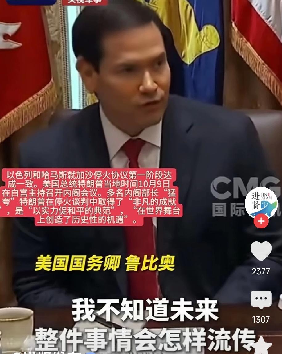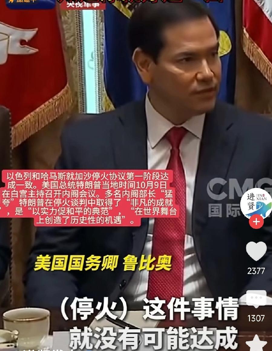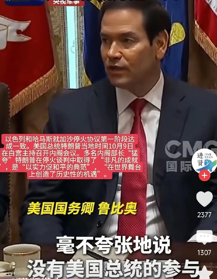 美国国务卿鲁比奥的“夸夸”其谈:我不知道未来整件事情会怎样流传,但昨天发生的事足以让我这么说,毫不夸张地说,没有美国总统的参与,(停火)这件事情就没有可能达成。 这是在白宫召开的关于特朗普促成加沙停火谈判的内阁会议上,作为国务卿的鲁比奥猛夸特朗普取得的非凡成就时的精彩一幕。鲁比奥自然是有两把刷子,第一个发言就把特朗普夸的“龙颜大悦”,并不失时机的拍拍鲁比奥的身体。这种肢体语言好似在说:鲁老弟,说的不错,吾心甚慰,加油! 其他内阁部长一见鲁比奥抢夺了先机,自是争先恐后的“猛夸特朗普在促成加沙停火谈判中取得了“非凡的成就”,是“以实力促和平的典范”……。