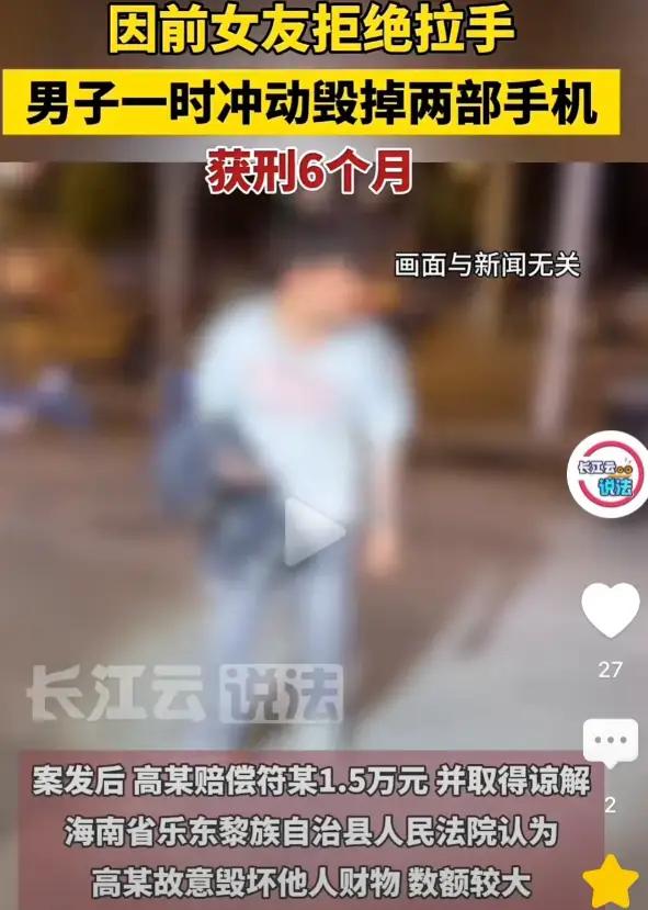海南,高某和符某经介绍恋爱,凌晨2点,高某带符某和她女儿逛商场,想牵手被符某多次拒绝,觉得失了面子后情绪失控,抢过符某女儿手中的两部手机摔坏,符某报了警,经鉴定手机价值6834元,高某被采取刑事强制措施。 (来源:裁判文书网 海南省乐东黎族自治县 人民 法 院) 据了解,高某和符某经朋友牵线搭桥后,谈起了恋爱,两人相处倒也还算融洽。 2024年8月5日凌晨2点,高某却拉着符某和她的女儿,一同闲逛,在某商场门口,人来人往,不少情侣手牵着手。 高某也想和符某牵手秀秀恩爱,他伸出手时符某却像是触电一般,迅速地躲开了。 高某以为符某是没反应过来,便又试了一次,这次他更加小心,可符某依旧毫不犹豫地拒绝了他。 高某觉得在这么多人面前,自己的面子全没了。 此时,符某的女儿正拿着两部手机,在一旁玩。高某像是失去了理智,冲过去一把从孩子手中抢过手机。 孩子被吓得哇哇大哭,符某也没想到,高某会做出这样的事情,还没等她反应过来,高某便用力将手机扔了出去。两部手机摔在地上,瞬间碎了一地。 符某看着破碎的手机,又看看情绪失控的高某,等她回过神来,立刻报了警。 经过鉴定,被摔坏的两部手机价值6834元。高某也因为涉嫌故意损毁他人财物罪,被警方采取了刑事强制措施。 案发后,高某似乎意识到了自己的错误,他主动找到符某,提出赔偿。 他东拼西凑,拿出了1.5万元交给符某,希望能得到她的谅解。 符某看着眼前这个曾经熟悉,如今却有些陌生的男人,最终,她还是选择了谅解高某。 然而,法律并不会因为他的悔过和赔偿就轻易放过他。高某还是被提起了公诉。 那么,高某的行为会受到什么样的处罚? 高某的行为,涉嫌故意毁坏财物罪。 根据刑法第二百七十五条规定,故意毁坏公私财物,数额较大或者有其他严重情节的,处三年以下有期徒刑、拘役或者罚金;数额巨大或者有其他特别严重情节的,处三年以上七年以下有期徒刑。 故意毁坏财物罪的构成要件: 1,包括主观方面是故意,即明知自己的行为会导致公私财物被毁坏,而希望或放任这种结果发生。 高某因被符某拒绝牵手,为发泄情绪,主观上明显具有故意毁坏符某女儿手机(属于符某的财物)的故意。 2,客观方面表现为实施了毁坏公私财物的行为,且数额较大或者有其他严重情节。 在客观上,他实施了抢过手机并摔坏的行为,且经鉴定手机价值6834元。 按照相关司法解释,故意毁坏公私财物,造成公私财物损失五千元以上的,应认定为数额较大。 所以,高某的行为,符合故意毁坏财物罪的构成要件。 不过,高某在案发后主动找到符某提出赔偿,并拿出了1.5万元,最终获得了符某的谅解。 根据刑法规定,对于被判处拘役、三年以下有期徒刑的犯罪分子,同时符合犯罪情节较轻、有悔罪表现、没有再犯罪的危险、宣告缓刑对所居住社区没有重大不良影响等条件的,可以宣告缓刑。 高某的犯罪情节属于数额较大,且其有悔罪表现,积极赔偿并获得谅解,符合适用缓刑的条件。 最终,审理后认定高某构成故意损坏他人财物罪,鉴于其有悔罪表现且获谅解,依法适用缓刑,判处其有期徒刑6个月,缓刑一年。 缓刑考验期内,如果高某遵守规定,没有再犯新罪等情形,原判刑罚就不再执行。 从赔偿金额与损失金额比例来看,手机损失6834元,高某赔偿 1.5 万元,赔偿金额超出损失金额约 119%,这在一定程度上体现了高某的悔罪诚意。 您对这件事有什么看法呢?
