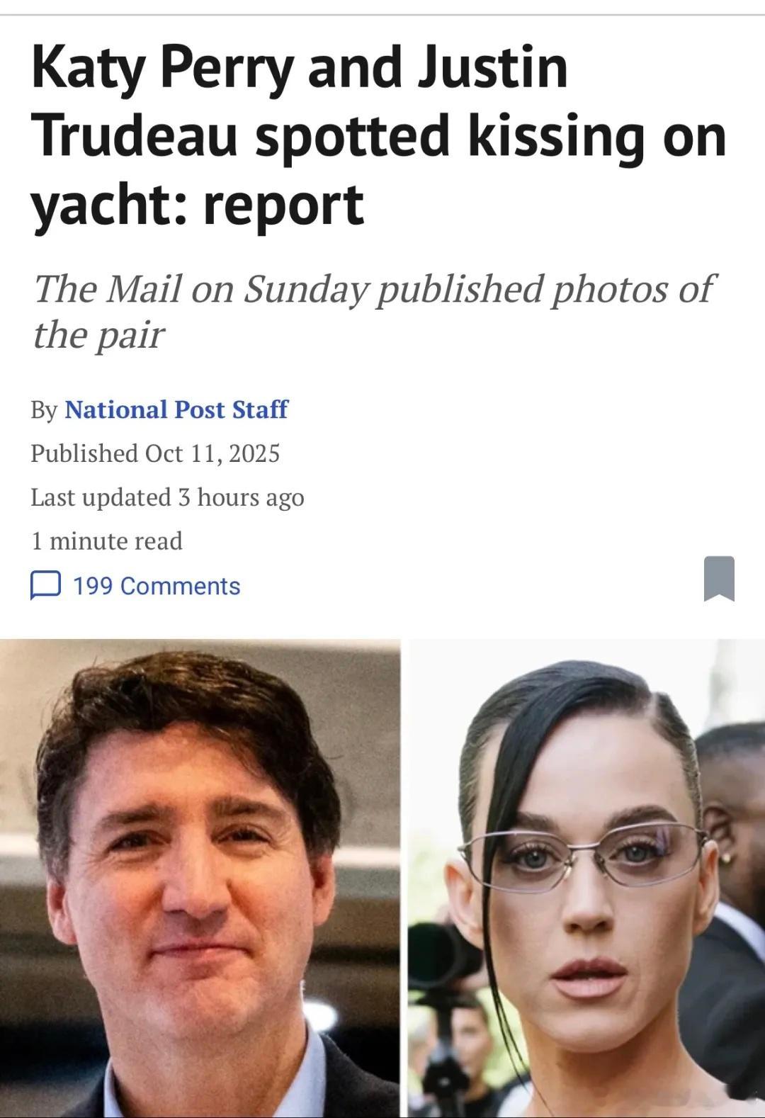 加拿大前总理贾斯汀·特鲁多和流行歌手凯蒂·佩里在加州海岸附近的佩里游艇上接吻拥抱。