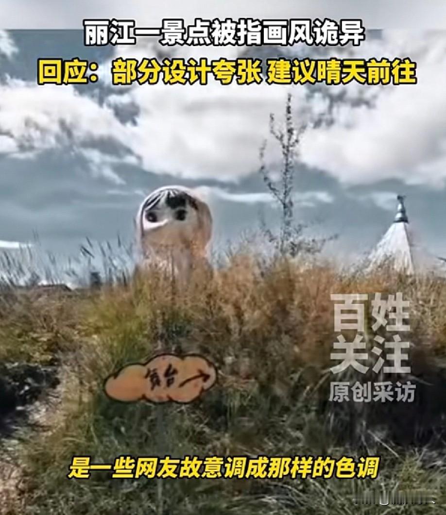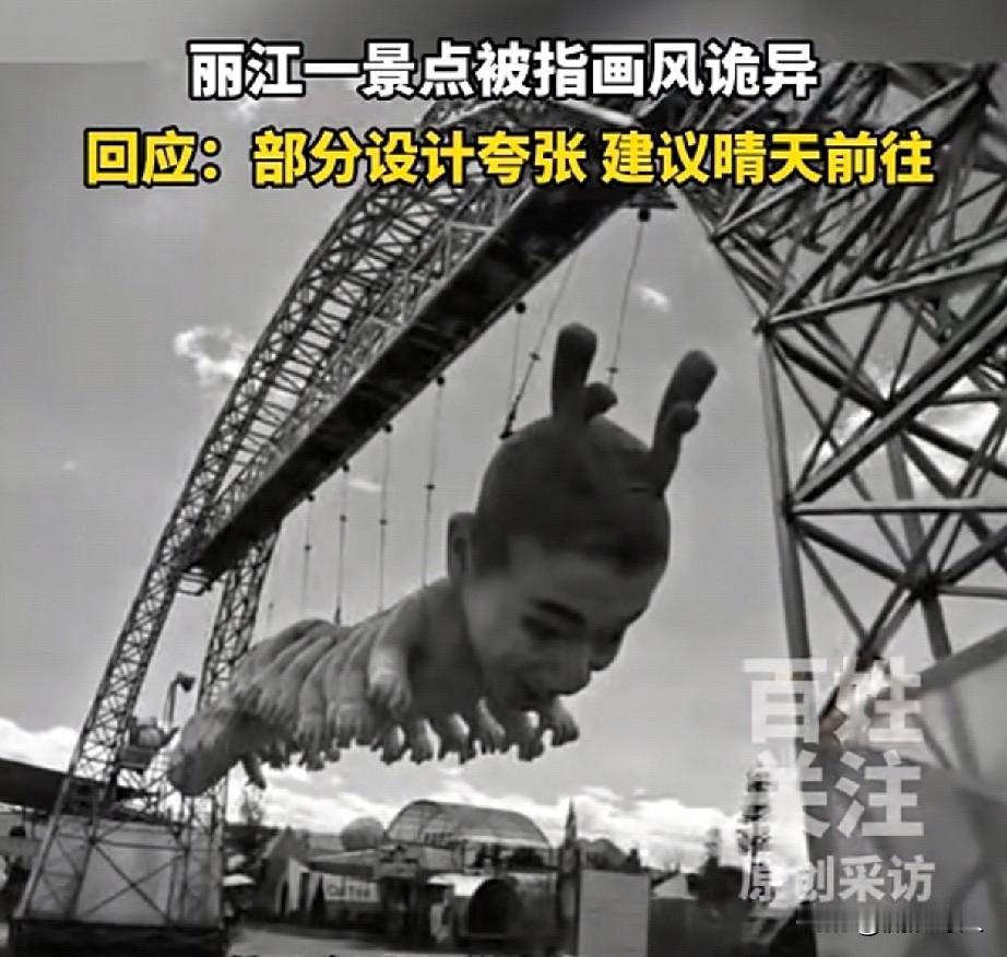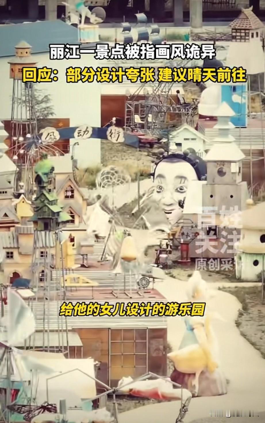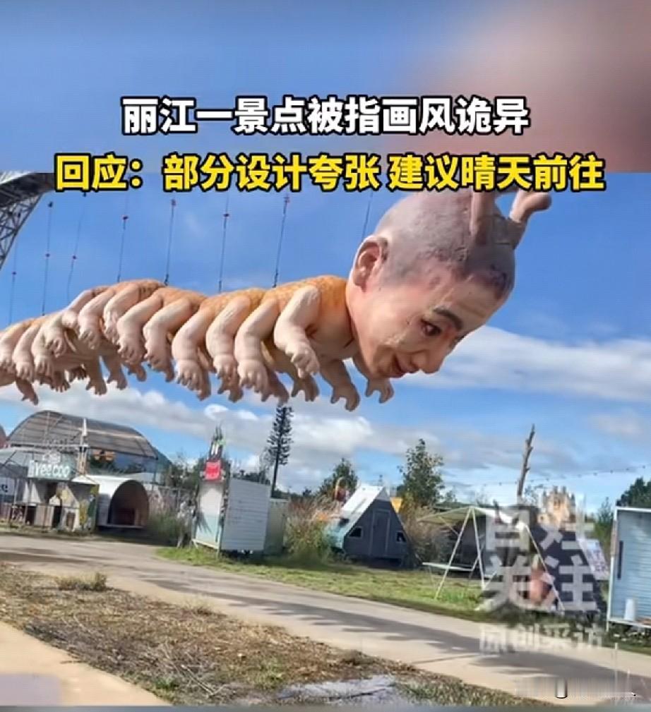 😱人体蜈蚣、三面女孩...这画风太惊悚诡异了 而这画风,出自丽江的【荒野之国景区】内,网友:这设计看得让人毛骨悚然... 据客服回应,这设计是由设计大师专门为女儿设计打造,主打的还是一个“梦幻温馨的童话王国”。不过这画风看上确实是很“梦幻”,至于“温馨”二字,则是见仁见智了。 而网友的评价也是呈现出一边倒的状态: →我无法接受这种画风,心里的确不适,密集恐惧症。 →一点也不童话,一点也不梦幻,感觉有点黑色恐怖故事的感觉! →这造型,真是有点辣眼睛!🙈 →这么诡异还童话,不怕吓到小孩子😱 ...... ⚠️而工作人员客服也作出了回应,并且给出了游客温馨提示Tips: 建议游客提前考虑小朋友能不能接受,尽量选择晴天来游玩,晴天下的色彩会显得比较温馨一点,阴雨天气可能会受到一些影响。 (消息来源:极目新闻、百姓关注)