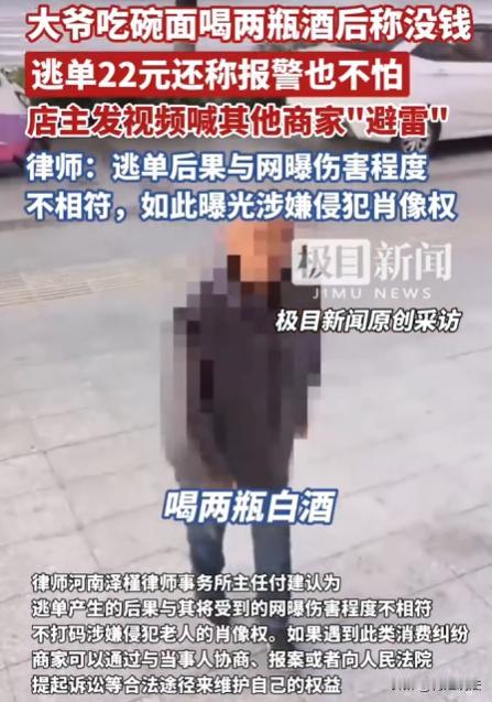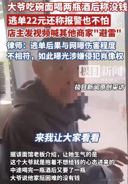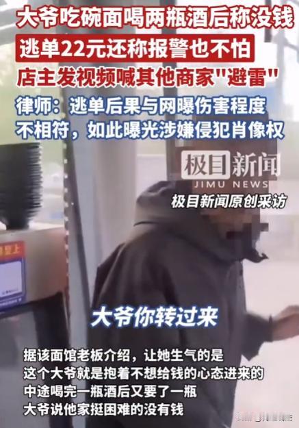 吉林白城,一家面馆老板发视频引发关注:一大爷进店点一碗面和两小瓶酒,消费22元。吃完后大爷称没钱要走,还表示报警也不怕。老板为不影响生意让大爷离开,拍下视频发网上提醒其他商家“避雷”。 (信息来源:2025-10-11 20:25·极目新闻) 10月11日,一家面馆老板在网上发了个视频,瞬间在网上开了锅,不少人都发表了自己的看法。 这事,还得从10号那天说起,当天,店里陆陆续续有客人进出,快到中午的时候,店里来了个老大爷。 大爷穿着一件洗得有些发白的外套,头发花白,脸上带着几分疲惫。他一进门,就扯着嗓子问,有没有酒。 老板赶忙迎上去,说有,有大瓶的也有小瓶的,大爷犹豫了一下,选了小瓶的,还点了一碗热气腾腾的面。 老板手脚麻利地把面和酒端上桌,大爷便慢悠悠地吃了起来。 他一边吃着面,一边时不时地抿上一口小酒,那神情,看起来还挺惬意。 中途,大爷喝完了一瓶酒,又让老板拿了一瓶,老板也没多想,又给他拿了一瓶。 店里的客人越来越多,马上就要迎来吃饭的高峰了,这时候,大爷也吃完了面,喝完了酒。 老板笑着走过去,跟大爷说,一共22元,谁知大爷一听这话,脸色立马就变了,他皱着眉头,说自己家里困难,没钱。 老板一听,这哪行,便跟大爷理论起来,老板说如果不给钱 ,就让民警来处理。 没想到,大爷竟然理直气壮地说,你找民警他也没有用。 店老板看着店里马上就要涌进来的客人,又怕因为这事影响了自己的生意,毕竟这高峰期,要是闹起来,会影响其他客人吃饭。 店老板先把大爷请到店外,大爷临走的时候还说,你拍我也不怕。 老板看着大爷的样子,又气又无奈。 他心想,这22块钱虽然不多,可要是就这么让大爷走了,以后他再这么干,或者别的老人也学他,那自己这生意还怎么做。 但是,老板又怕报了警之后,事情闹大了,老人耍赖,到时候更麻烦。 于是,他灵机一动,拿出手机把大爷的样子拍了下来,还把这事的前因后果录了个视频。 等高峰期过了,老板就把这个视频发到了网上,想提醒一下其他同行,遇到这个大爷可得小心点,别吃了亏。 视频发出去之后,很快就引起了网友们的热议。 有的人说,这大爷也太不应该了,没钱就别出来喝酒吃面。 也有人说,老板这么做是不是有点过分了,把老人的视频发到网上,会不会侵犯老人的隐私。 随着事情越闹越大,也有一些专业的法律人开始关注这件事。 法律人指出,店家拍视频公开老人肖像,初衷是好的,是为了避免其他店家受损,但是最好给老人的面部特征打码。 毕竟逃单造成的后果和老人可能遭受的网曝伤害程度不对等,不打码的话,将会侵犯老人的肖像权。 而且,店家遇到这种消费纠纷,其实也有合法的途径可以维护自己的权益。可以先和当事人好好协商,看看能不能把问题解决。 要是协商不成,还可以让民警介入处理。 要是问题还是没解决,也能提起诉讼,通过法律来讨回公道。 那么,以法律角度,该如何看这件事呢? 1,大爷在面馆消费22元后,以没钱为由拒绝支付。 从法律层面看,大爷与面馆老板之间形成了服务合同关系。 根据《民法典》的规定,当事人应当按照约定全面履行自己的义务。 大爷在面馆消费,享受了面馆提供的面和酒,就应当按照约定支付22元的费用。 大爷拒不支付的行为,属于违约行为。 如果大爷主观上存在非法占有老板财物为目的,在消费后故意不付款,且数额达到一定标准,还可能涉嫌诈骗罪。 不过本案中22元数额较小,一般不构成诈骗罪,但这种行为,违背了基本的诚信原则和法律规定。 2,老板在面对大爷拒付餐费时,担心影响生意让大爷离开,之后将大爷的视频发到网上提醒其他店家避雷。 老板拍摄并公开大爷没有打码的视频,这一行为,存在一定的法律风险。 根据《民法典》规定,自然人享有肖像权,未经肖像权人同意,不得制作、使用、公开肖像权人的肖像,但是法律另有规定的除外。 老板未经大爷同意,将大爷的肖像公开在网络上,侵犯了大爷的肖像权。 虽然老板的初衷是为了避免其他商家遭受类似损失,具有一定的合理性,但法律在保护店商家合法权益的同时,也注重对公民肖像权的保护。 即便大爷存在过错,老板也不能通过侵犯大爷肖像权的方式,来解决问题。 3,对于老板侵犯肖像权的行为,大爷有权要求老板承担侵权责任。 根据《民法典》规定,承担侵权责任的方式主要有停止侵害、消除影响、赔礼道歉、赔偿损失等。 大爷可以要求老板删除视频,消除视频带来的不良影响,并向自己赔礼道歉。 如果因为视频的传播,给大爷造成了精神损害等损失,大爷还可以要求老板进行相应的赔偿。 如果通过法律解决,将会让大爷支付22元的餐费,对于老板侵犯肖像权的行为,店老板也应该承担相应的侵权责任,通过删除视频和赔礼道歉这些行为动作,减小对大爷的侵害。 对于此事,你怎么看呢?或是有什么更好方式能处理好这件事呢?