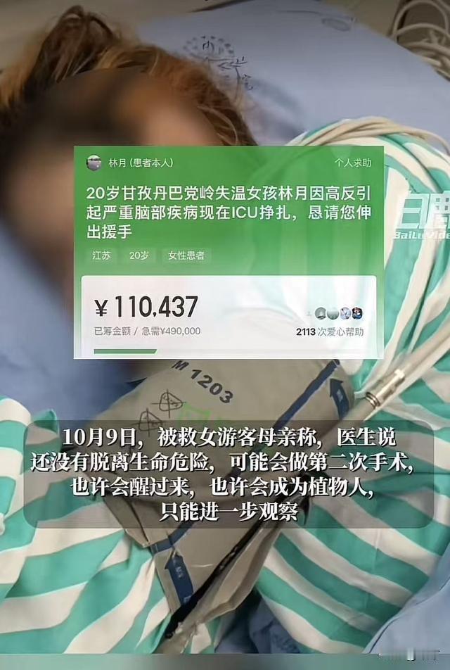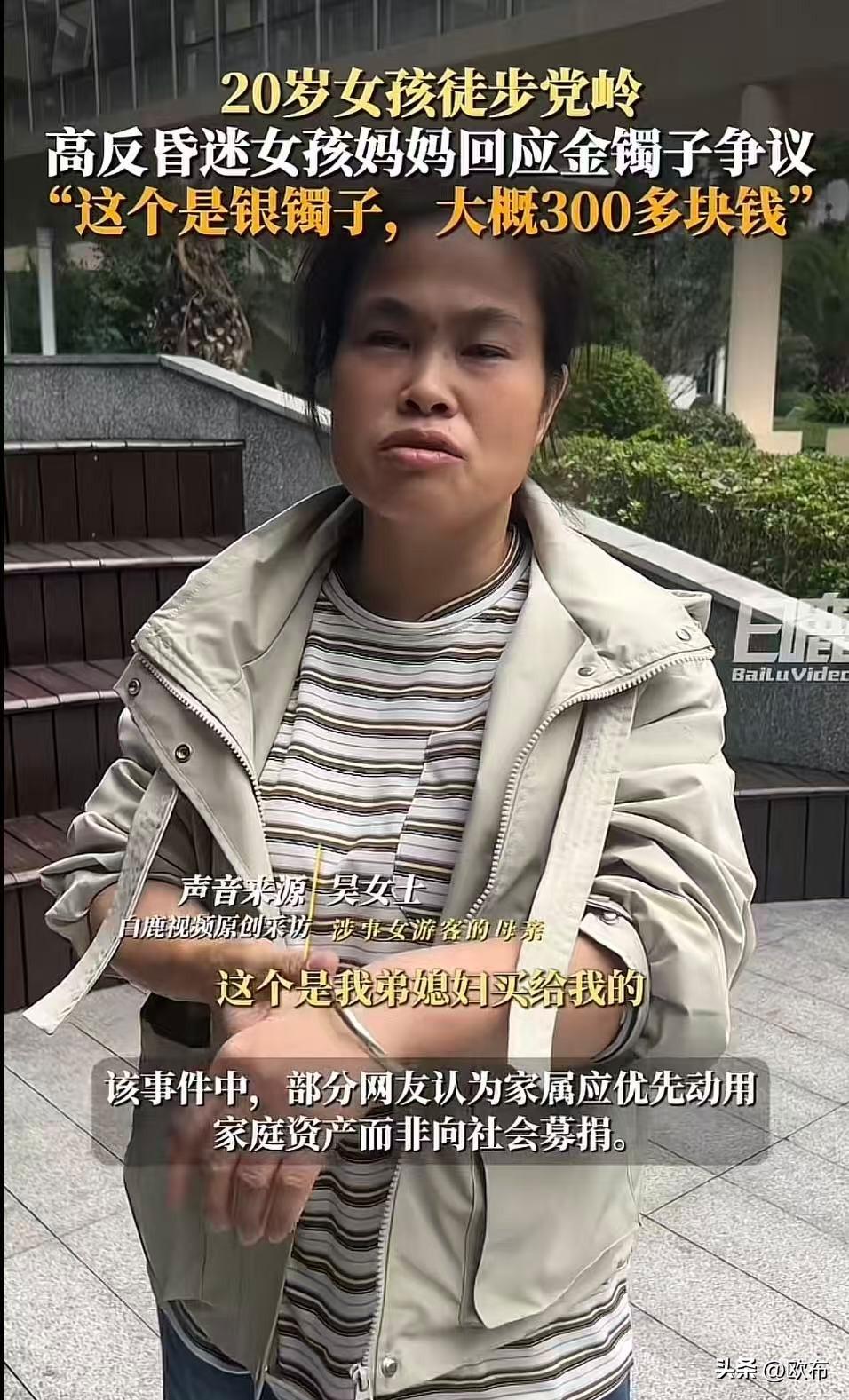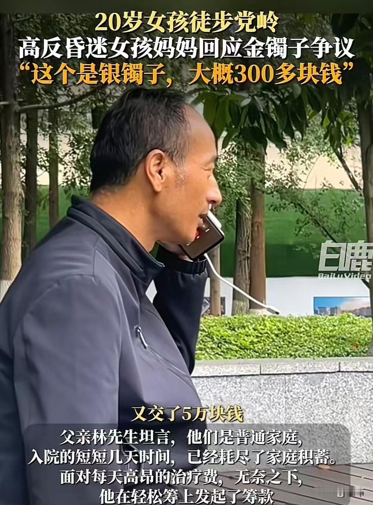 党岭失温女孩林月母亲回应网友对金镯子的质疑了。 林月母亲说,这镯子不是金的,是弟媳妇送的银镯子,才三百块钱。 网友注意到了一个细节,这次露面,夫妻两个在服装上似乎更接近家徒四壁的人设了。 最初夫妻俩穿戴板板正正,这次感觉有些憔悴潦草。 这次手腕上戴的确实是银镯子。 林月父亲说,刚刚又交了五万块到医院,这点钱远远不够,治疗费需要大概49万,希望广大网友伸出援手,帮帮可怜的孩子,毕竟她才二十岁。 他们家只是普通家庭,入院才短短几天,就花光了家里所有积蓄。无奈之下,才在轻松筹上发起了筹款,目前已经筹到了十一万元。 救人一命,胜造七级浮屠,拯救病人刻不容缓,希望这个二十岁的姑娘能够挺过来,她是学护理专业的,以后一定也会救助更多的人,来回馈这些曾经帮助过她的人。 可千万别让这些好心人寒心啊,捐款专款专用吧。 但对于这家人,网友还是质疑多于信任,希望他们说的都是真的,也希望姑娘早日康复。
