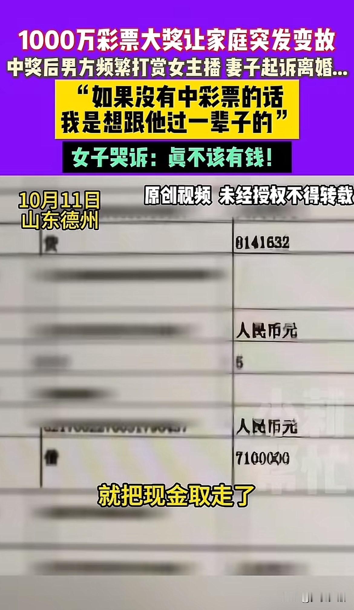 真的是男人有钱就变坏吗? 没中奖时,想着和他过一辈子 有了钱,他立马就背叛了我! 山东德州的一个20年的老彩迷,终于梦想成真了,中了1017万,税后814万。原本以为一家人可以更加的幸福,却没想到,平静的生活再也平静不了了。 苑女士和她现在的老公是2015年认识的,2016年结的婚,现在两个人在一块差不多有10年了,她是离异的,然后带了一个孩子,和丈夫结婚后两人没有自己共同的孩子。丈夫痴迷买彩票,哪怕没有钱,想办法也要买。在去年十二月份的时候,梦想成真了,花了42块钱,中了1017万,税后有814万,当时丈夫把这个好消息分享给她了,两人还一起出去旅游,回来了之后,丈夫给了她一张300万的卡,说让妻子保管,留着以后二人养老。苑女士还挺感动的,出于对丈夫的信任,她就随手把卡放在了抽屉里。 之后,丈夫整个人都开始飘了,出去赌博,整夜看直播,给女主播巨额打赏,甚至与女主播同进同出,恩爱的像小夫妻。 丈夫对自己越来越没有耐心,不愿意跟自己解释,苑女士决定离婚,她想起了自己放在抽屉里的300万的银行卡,哪知道一查余额为0。 她感觉天都塌了,自己那么信任丈夫,丈夫却欺骗她,背叛他,真的太让人心寒了。 原本想要过一辈子的两个人,现在却成了最熟悉的陌生人,甚至还要对簿公堂了,真让人唏嘘呀。