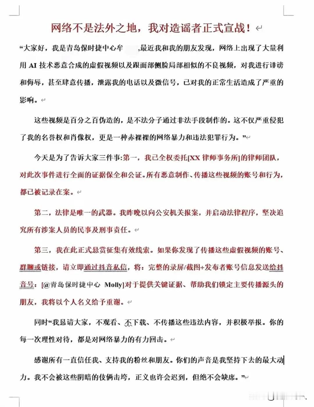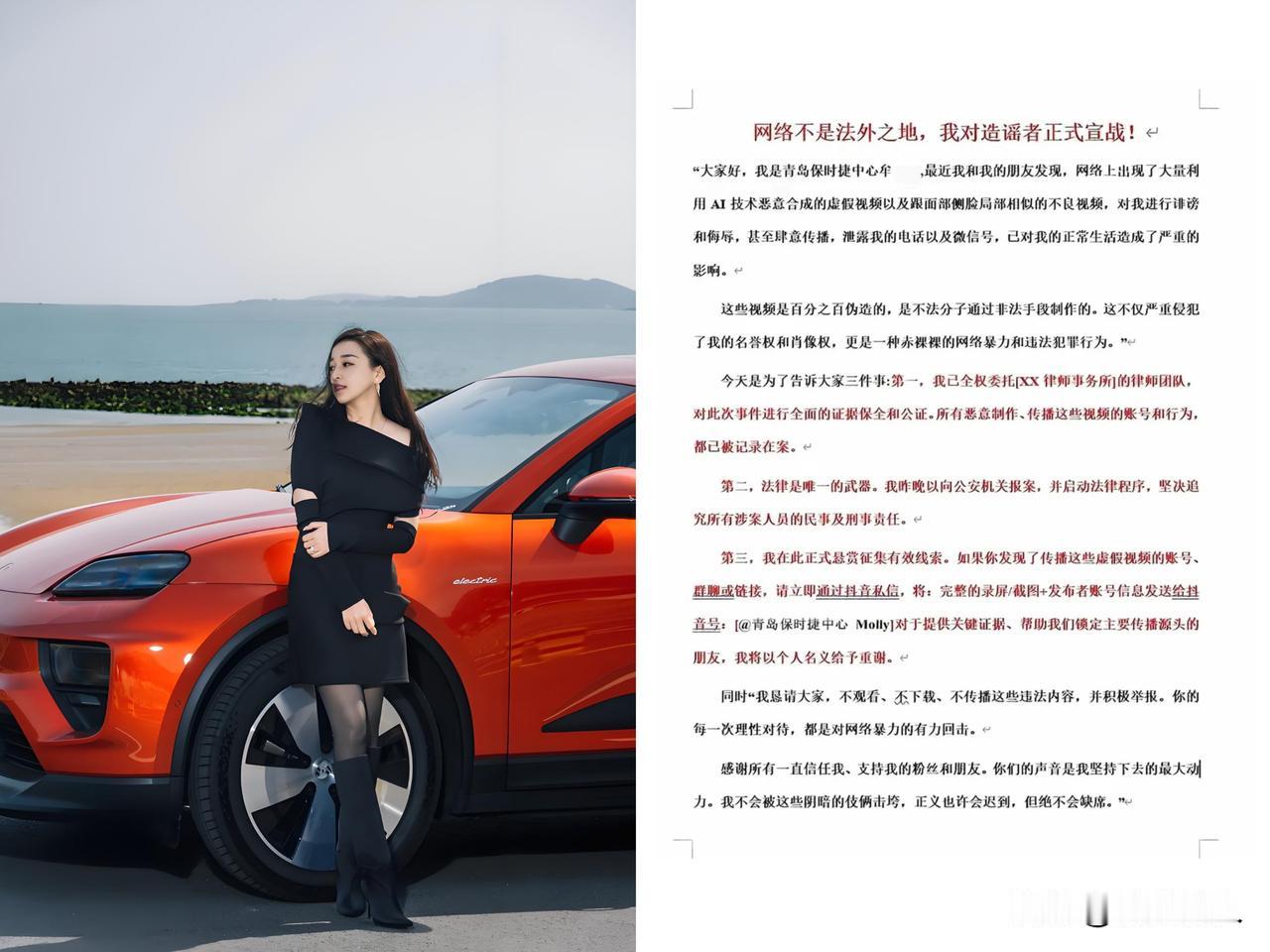👨老司机:找你提车有什么福利? 可以的话我下午过来找你订... 💃女销售:...恳请大家,不要再通过电话等方式对她进行骚扰了,不再再向她申请添加好友好友申请了。 青岛保时捷美女销冠 最近被人恶意ai合成不雅视频、图片流出 且把她的联系方式泄露 遭到大量目的不纯的金主频繁骚扰 收到大量带目的的微信好友添加申请 使得青岛保时捷美女销冠牟小姐不堪其忧 牟小姐怒而维权,拿起法律武器 把造谣、传谣者送上法庭 最终,涉事者被送进拘留所 网友拍手称快 长的漂亮且能力出众不是罪 像这种“本可靠脸吃饭” 还把自己练就得一身本领的励志者 本应受到推崇和称赞 可偏偏却有些人不知道这些人是处于什么目的和心态,造谣诽谤、侮辱 💡这件事也提醒我们: 网络不是法外之地,每个人都要对自己的言行负责,一切虚假、造谣、传谣者都将受到打击,承担法律责任。 我们每一个人都要秉承“不造谣、不信谣、不传谣”的生活态度,坚守法律的红线。 (消息来源:极目新闻)