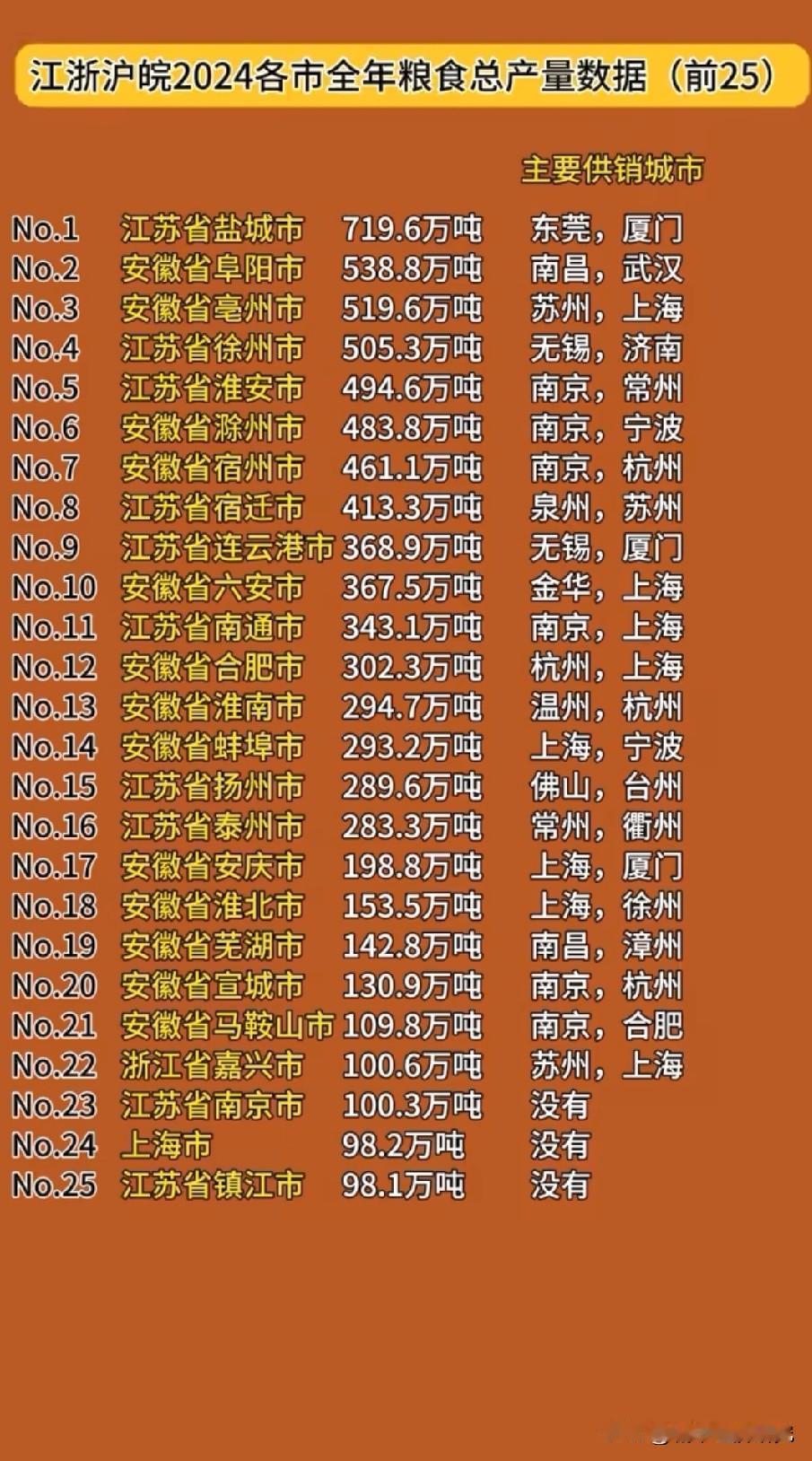 2024年江浙沪皖各城市粮食总产量排名情况,江苏盐城市粮食总产量以719.6万吨排名榜一,整体来看江浙沪皖粮食产量前25城,江苏省就有十个城市上榜,可见江苏不仅是经济大省,并且也是农业大省,江苏省各方面综合实力都挺强大的。