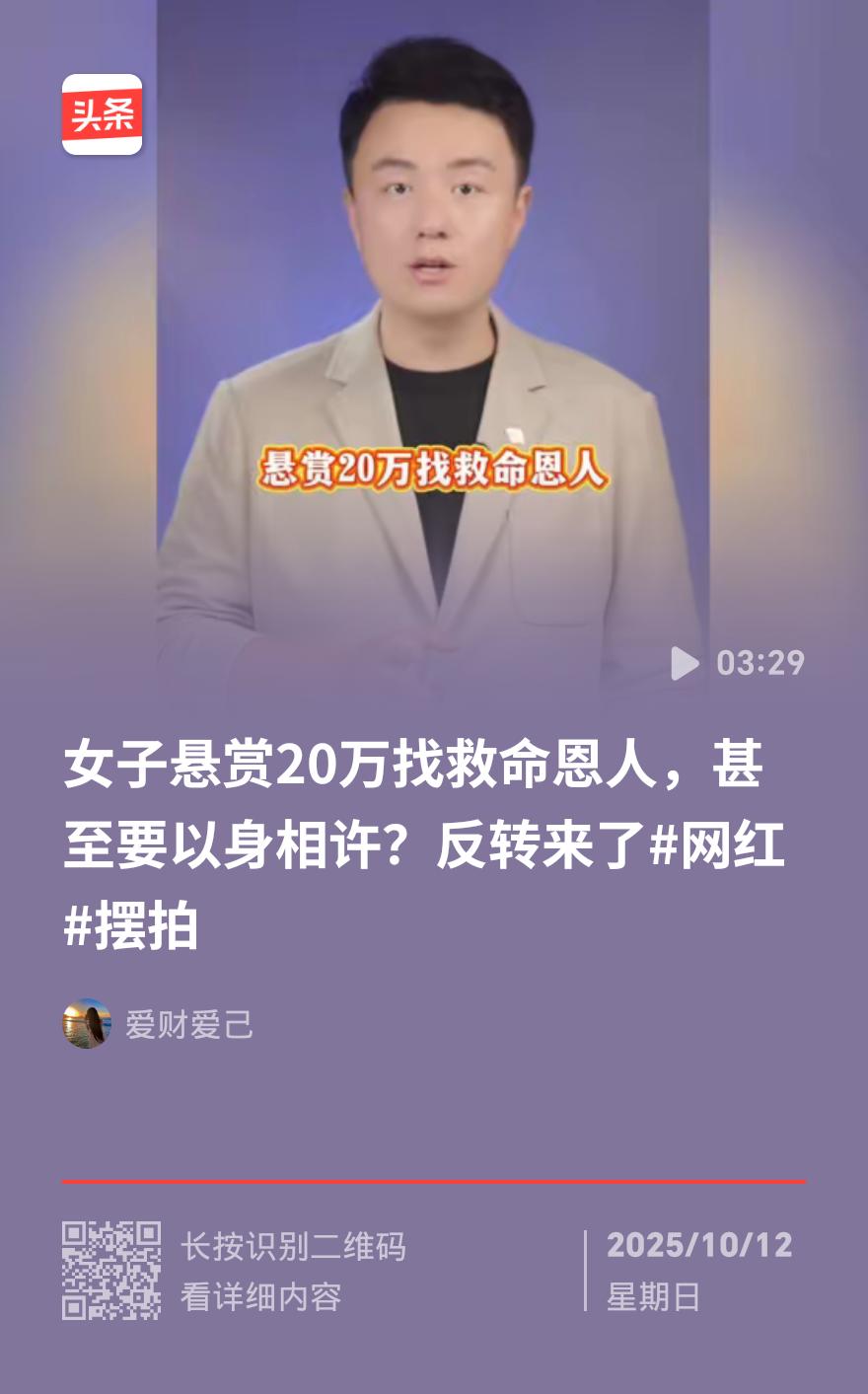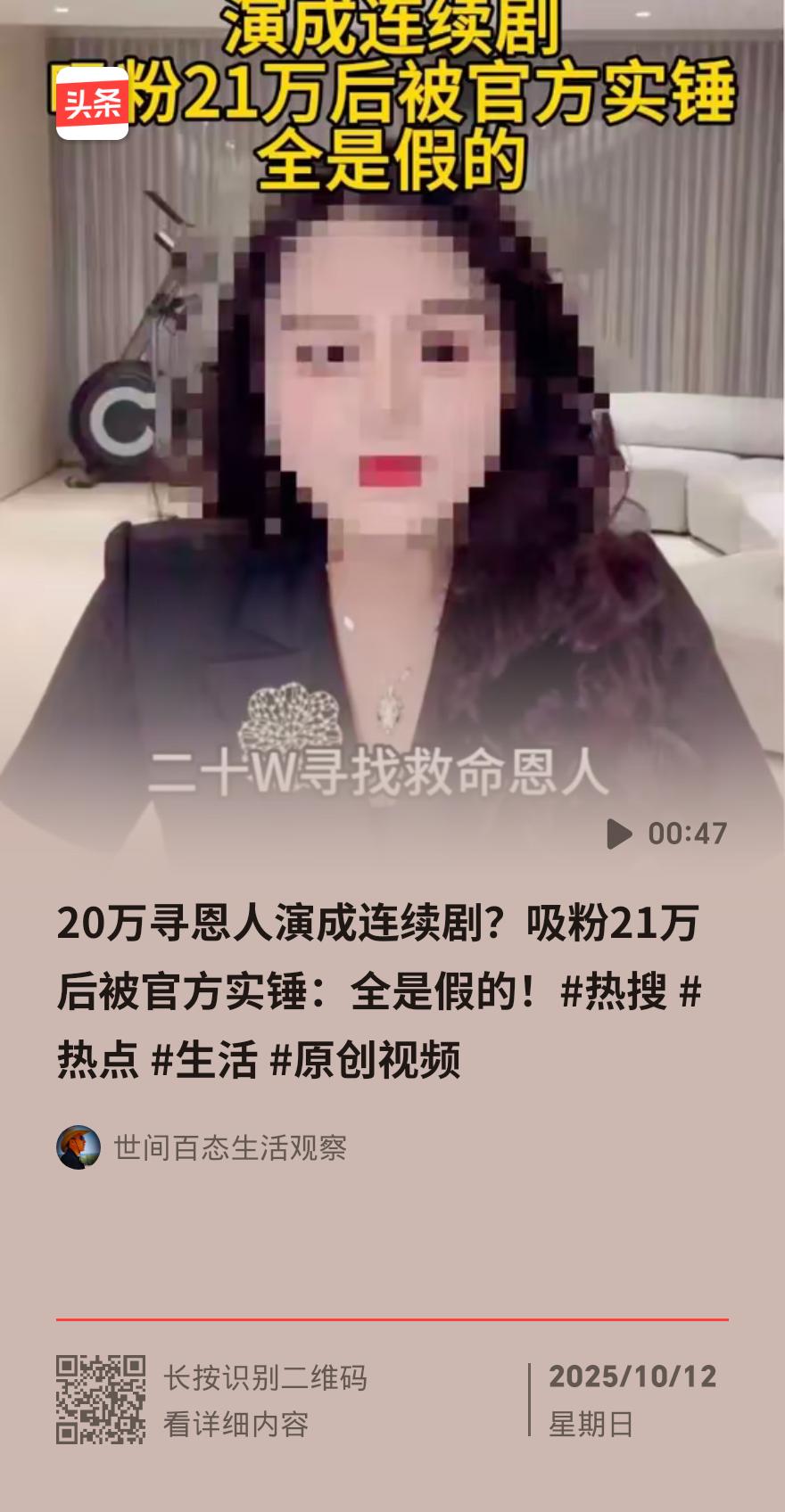 20万寻恩人是演的!6人组团编剧本骗粉,2人被拘太解气 “海边溺水被救,悬赏20万找恩人”——前段时间“宋雨霏”账号的寻恩视频赚足眼泪,结果全是演戏!公安部网安局10月12日通报,这伙人把网友当傻子耍,现在6人全被收拾了。 事情从8月21日开始,“宋雨霏”发视频说自己溺水被陌生男子救了,要花20万寻人。之后又更了10多条“寻恩进展”,剧情曲折得像电视剧,多个视频获数万点赞,粉丝涨了不少。 可网友不傻,有人看出季节、场景不对劲,质疑是剧本。一查才知道,宋某雪、何某龙为“起号”牟利,拉上4人摆拍,连“溺水”“恩人”全是编的,想吸粉后带货捞钱。 最终宋某雪、何某龙被行政拘留,另外4人被罚款。依据《治安管理处罚法》,这种骗流量的操作早踩了红线! 记住:网络不是戏台子,靠编瞎话博眼球,迟早栽在法律手里,别把公众善意当流量密码!20万找恩人