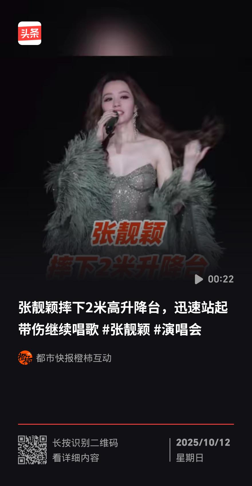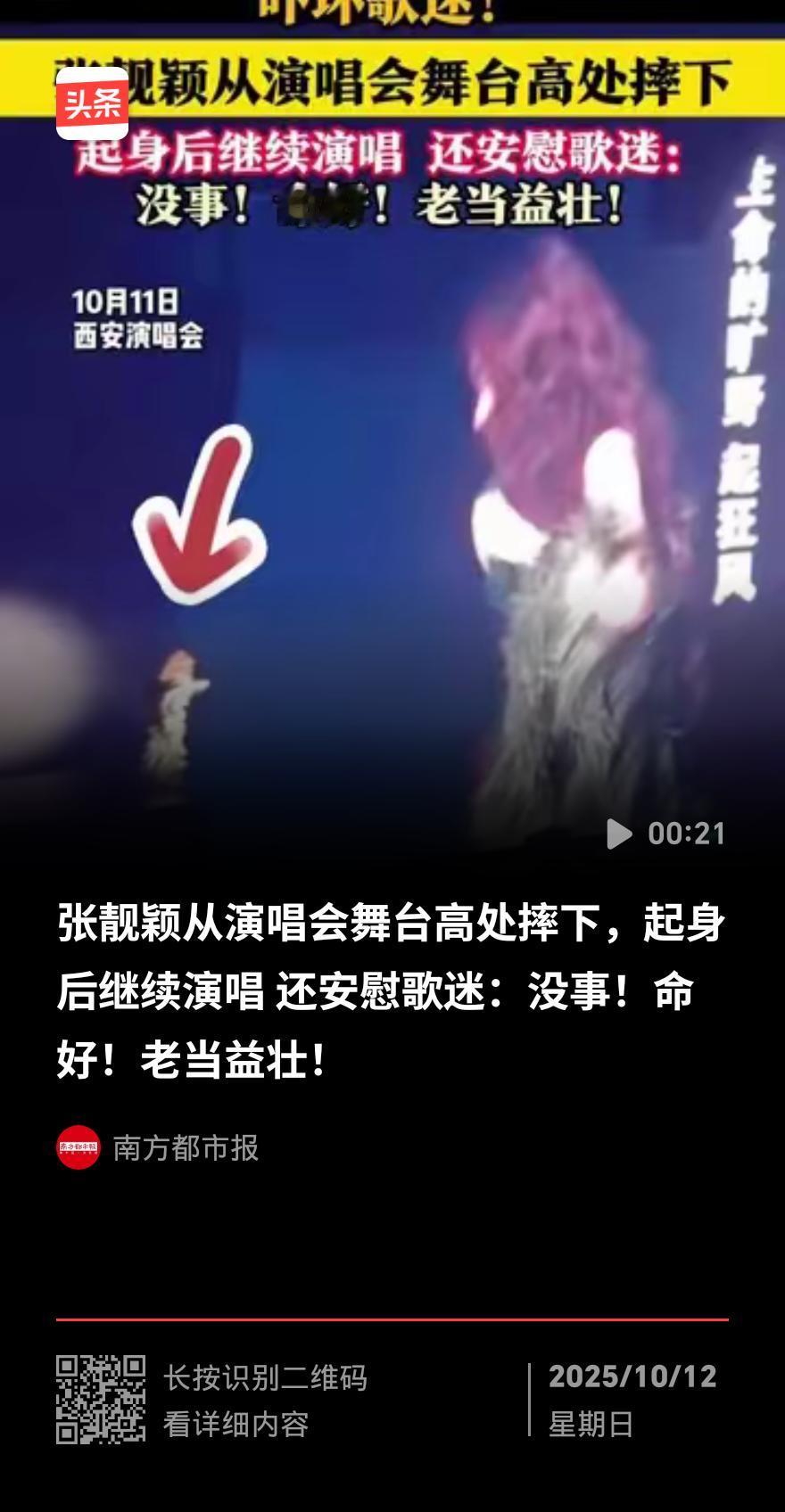 生日场摔下2米高台!张靓颖带伤唱跳,自嘲像挨妈打,这隐患太吓人 41岁生日开唱竟摔下高台?10月11日张靓颖西安演唱会的惊魂一幕,看得人手心冒汗!正唱《暗恋》的她没留意舞台边缘,一脚踩空从两米多高的升降台摔下去,现场“砰”的闷响混着尖叫,粉丝瞬间吓哭 。 更揪心的是她穿了恨天高,工作人员都说腿和胳膊伤得厉害,本不该再上台。可她攥着话筒爬起来,20秒就接着唱,还笑着自嘲:“老当益壮,疼得跟小时候挨妈打似的”,硬生生撑完唱跳曲目《哪里来的好人》 。镜头扫到她手腕膝盖全是淤青,藏在裙子里的伤更不敢想。 这可不是她第一次遭罪!2015年北京演唱会就摔过升降台,去年成都场还差点因舞台湿滑摔倒。网友翻出细节:当晚舞台灯光昏暗,升降台边缘连个警示标都没有,出事了才见工作人员盯着。 想想杨宗纬前段时间也摔成肋骨断裂,只能侧睡复工,这舞台安全简直是“定时炸弹”!张靓颖事后报平安说“顺利跨年”,可粉丝更盼主办方上心——敬业不是硬扛的理由,别让艺人用身体给疏忽买单!张靓颖 张靓颖壁纸 张靓颖巡演