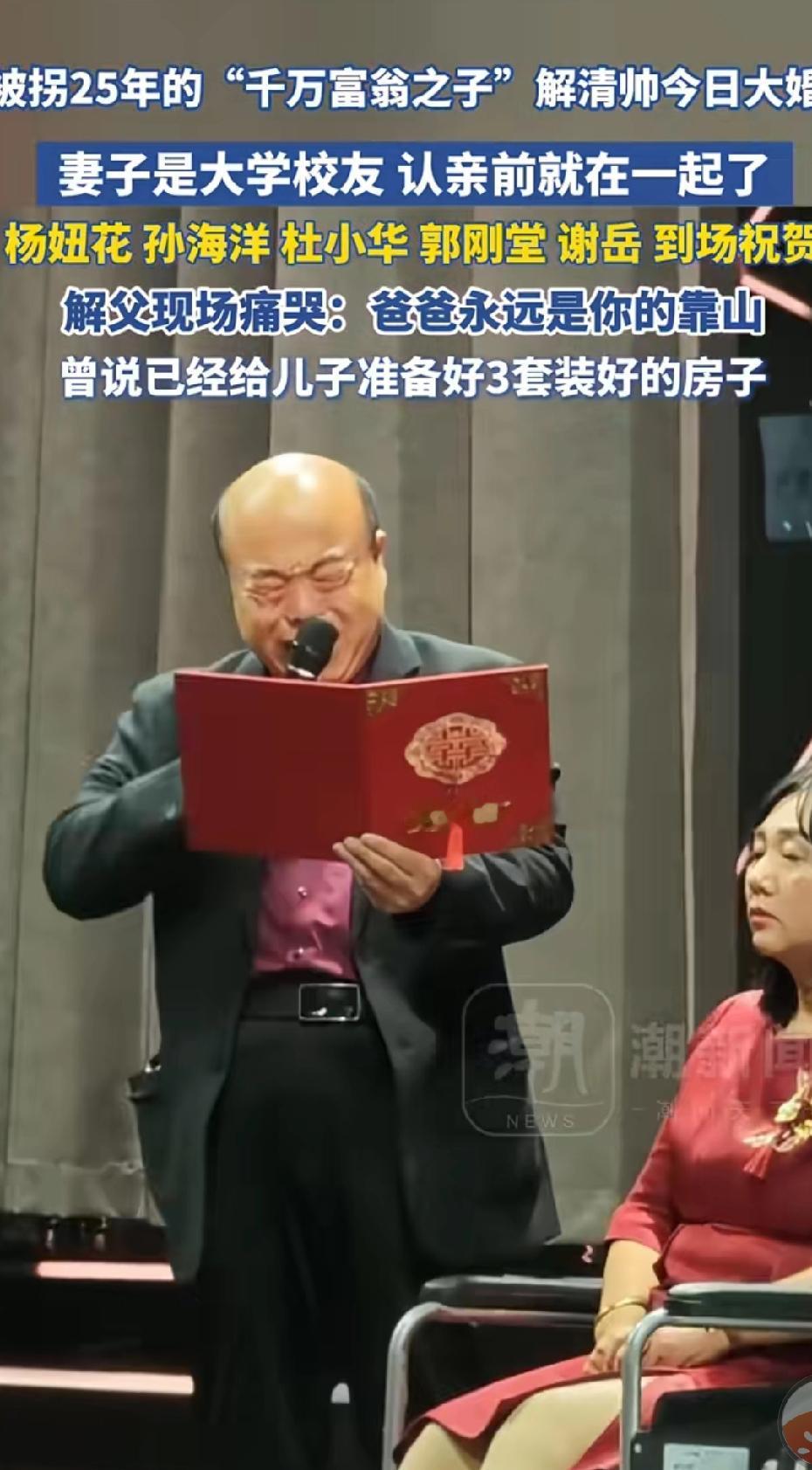 太特别了吧!解清帅妈妈真的坐轮椅参加儿子的婚礼致词了!妈妈坐在轮椅上面无表情是抑郁症又患了吗? 解清帅爸爸解克锋边哭边言词,说自己永远是儿子的靠山,这对父母也是真的不容易。 解清帅出生才100天,就被人贩子抱走了,养父母过世后跟着养家爷爷奶奶生活,25年后才回到亲生父母身边,亲生父母错过了他的成长。所以才会痛哭吧!