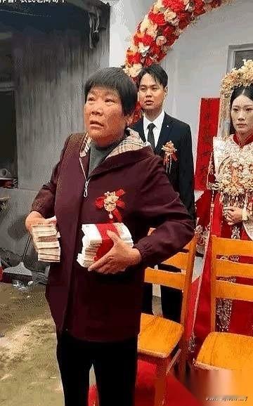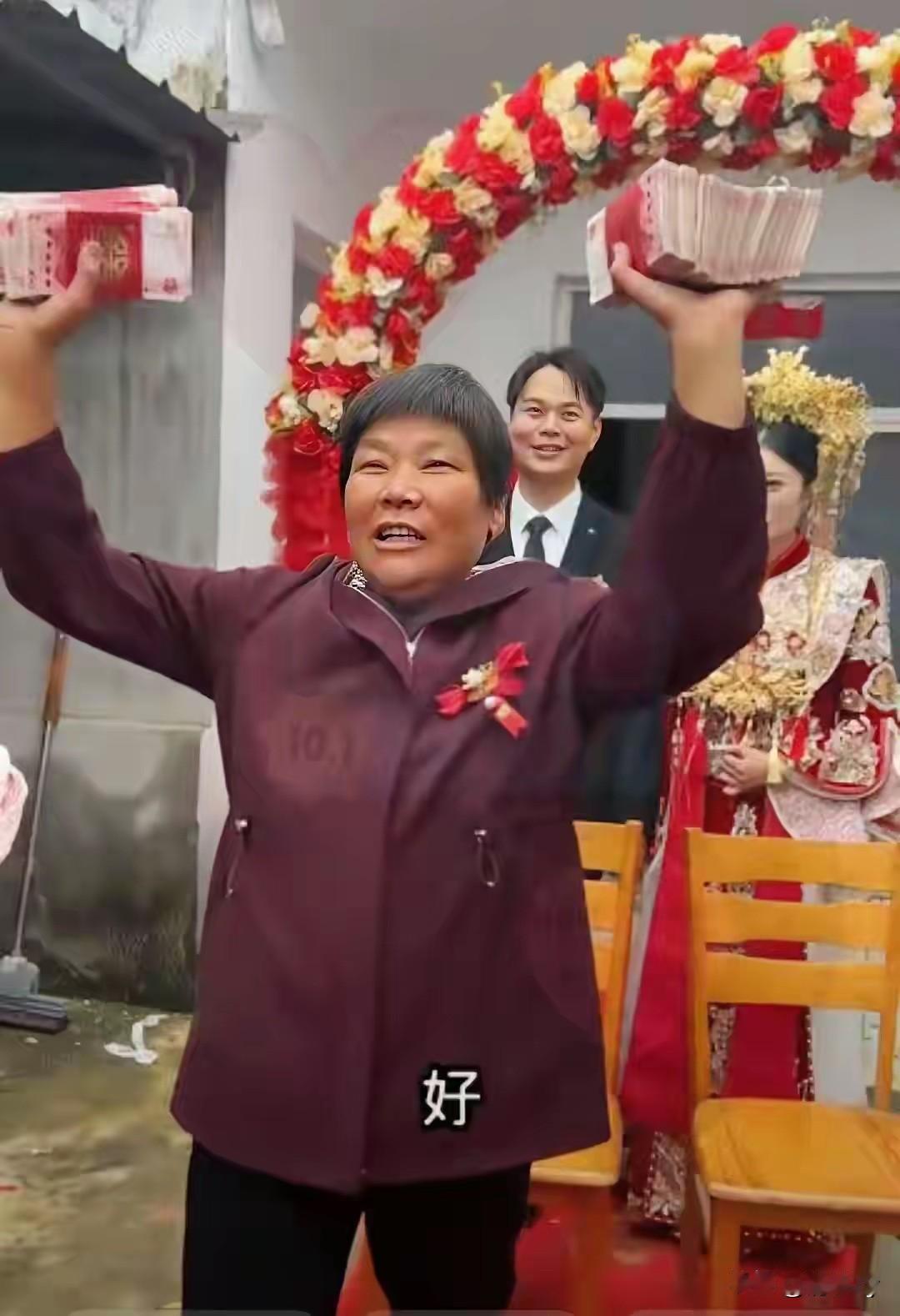 婚礼现场新娘的妈妈双手拿着两摞钱,高高的举起问现场的亲朋好友们:生女儿好不好?
