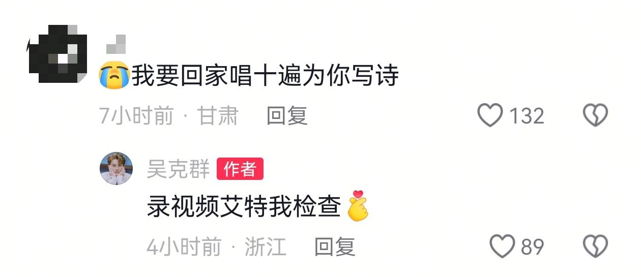 有网友被吴克群的善举感动,在评论区留言称要回家唱十遍《为你写诗》,吴克群则幽默回复:“录视频艾特我检查”。