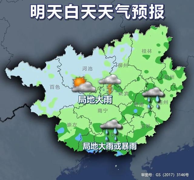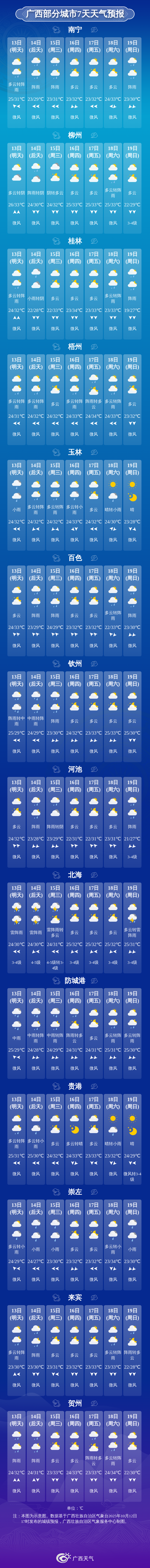 明天白天,崇左、防城港、钦州、北海、玉林、梧州、贵港、来宾、贺州、桂林等市有中雨、局地大雨或暴雨,其它地区多云有阵雨或雷雨、局地大雨。