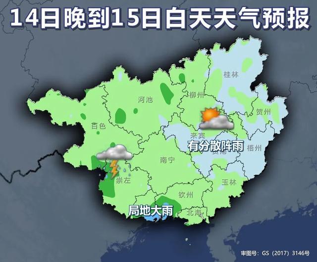 14日晚上到15日白天,桂西、沿海部分地区有阵雨或雷雨、局地大雨,其它地区多云有分散阵雨。