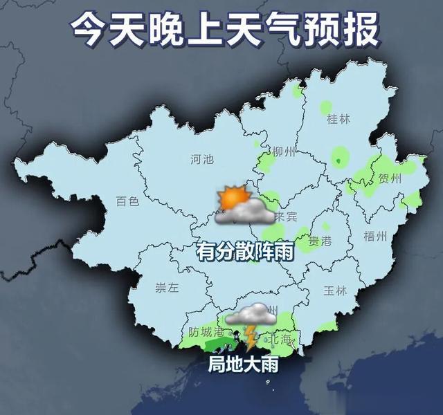 今天晚上,防城港、钦州、北海等市有阵雨或雷雨、局地大雨,其它地区多云有分散阵雨。