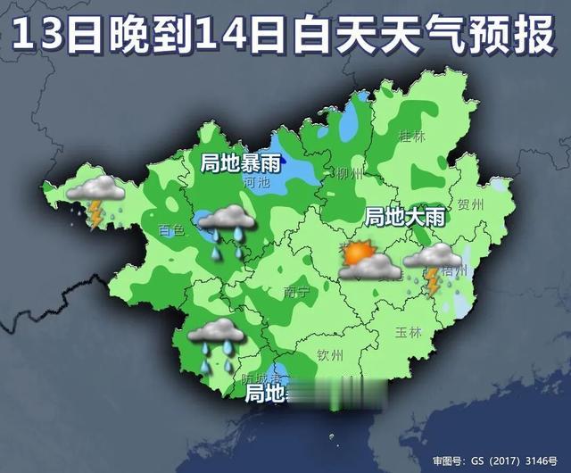 13日晚上到14日白天,桂北、桂西部分地区有中雨、局地暴雨,其它地区多云有阵雨或雷雨、局地大雨。
