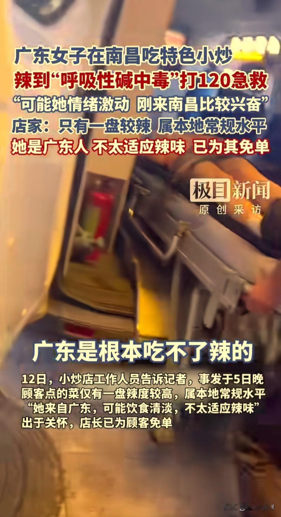 江西人的菜果然辣,广东女子在南昌吃特色小炒被辣到“呼吸性碱中毒”打120急救。 有网友发视频说,她妹妹从广东来江西玩,一起去一个江西小炒店吃饭,结果用餐后不久出现手麻、肢体颤抖等症状。 发现是呼吸性碱中毒,送医后在病床上休息了几分钟基本恢复了。网友说她妹妹还是比较能吃辣的,可能是旅途疲惫,加上吃饭速度比较快的原因。 店家也非常热心,帮忙找来口罩和塑料袋,还主动免了单。小炒店工作人员说,她们点的菜只有一盘菜辣度比较高,也属于当地常规水平的正常辣度,她可能是来自广东,那边饮食比较清淡,不太适应辣味。 来源:极目新闻 江西辣代表 江西小炒辣 江西辣疯了