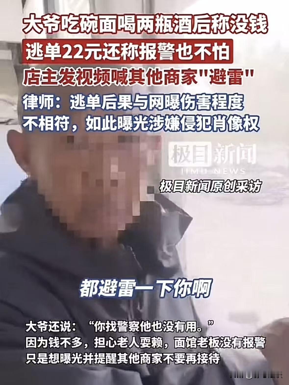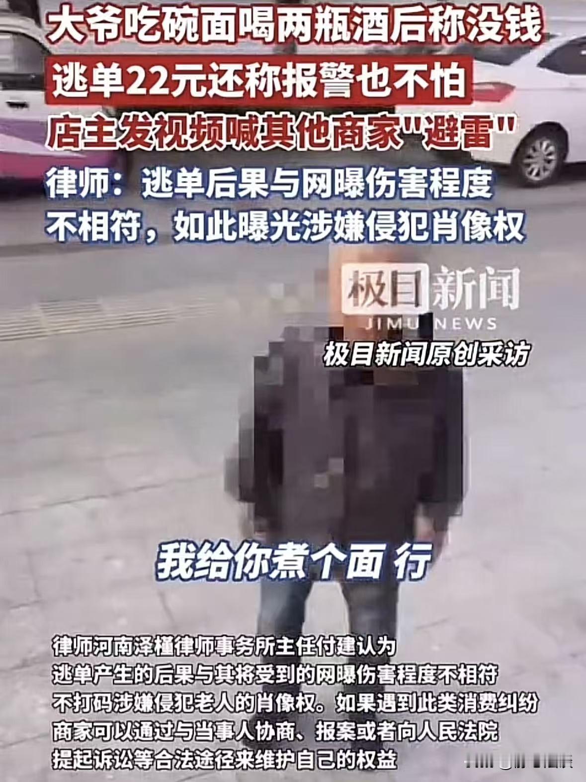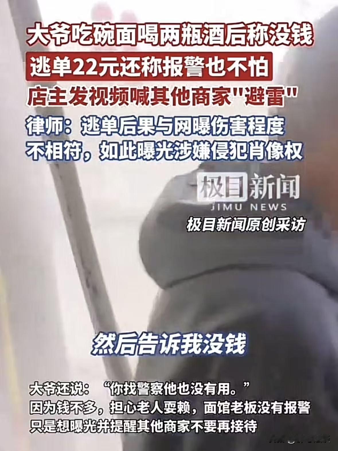 吉林白城,一大爷到面馆吃饭,点了一碗面和2瓶白酒共计22元,吃完没付钱就要走,被老板叫住结账,大爷称我家庭困难没有钱,老板气的拿出手机给大爷拍了下来,说要曝光他,你没钱说一声我给你煮碗面没问题,你还要了两瓶酒,合着你就是抱着吃霸王餐来的,岁数大也不能这么不讲理,大爷见状:你拍我也没用,你报警我也不怕,就是没钱。最后因为钱不多,担心大爷在耍无赖,老板只能认栽,最后将拍的视频发到网上,想提醒其他商家避雷。律师:如此曝光大爷涉嫌侵犯其肖像权! 一位大爷穿戴干净整洁,进了一个面馆准备吃饭。 进门就问老板有酒没,老板也实在,告诉大爷大的小的都有。 最后大爷点了一碗面和一小瓶白酒,吃到一半喊老板再要一瓶白酒。 老板没有多想,小本生意,岁数大的客人爱喝点小酒也正常,就给大爷拿过去。 等大爷把第二瓶酒喝完,面也吃完后,抹了抹嘴起身就往门口走,那架势跟付完钱了一样。 老板赶紧迎上去,笑着喊大爷,您还没付钱,一碗面两瓶白酒,一共22块。 结果大爷停下脚步,回头跟老板来了一句:我家庭困难,没有钱。 老板当时被这话也是给说懵了,这饭也吃了,酒也喝了,临了说没钱? 老板当时就急了,嗓门也高了点,意思大爷,您要是真没钱,进门您说一声,我就算给您煮碗面不收钱,那也没啥。 可您倒好,不仅吃面,还特意要了两瓶酒,合着您打从进门起,就没打算给钱,就是来吃霸王餐的? 大爷就算岁数大,那也不是不讲理的挡箭牌啊。 老板越想越气,掏出手机就对准了大爷,说要把他拍下来,发到网上,让大家评评理,也提醒别的商家别遭您的道。 谁料大爷半点不怵,梗着脖子硬气回应:你拍也没用,爱发就发!就算你报警,我也不怕,反正就是没钱。 那副有恃无恐的样子,把老板的火气顶得老高。 但眼看马上就到吃饭的高峰期,店里已经来了几桌新客人,都好奇地往这边张望。 老板看着大爷油盐不进的模样,心里犯了嘀咕:就22块钱,真要闹起来,大爷万一躺地上耍赖,生意就彻底没法做了。 权衡再三,她只能恨恨地摆摆手让大爷走了,可那句报警也不怕像根刺扎在心里。 可这口气咽不下去,老板越想越委屈,干脆把拍的视频配上文字发了网上。 就一句话:白城的商家们注意了,这人来店里吃面喝酒不给钱,大家避雷。 视频一出来,评论区直接炸了。 有律师指出,大爷逃单不对,但是跟老板把视频发到网上,让大爷遭网暴伤害程度不相比。 而且视频发出来还没有把脸打码,涉嫌侵犯肖像权。 这话一出,不少人懵了,难道被人白吃白喝,连提醒同行的权利都没有了? 对此,不少人表示:22块钱不多,但那是人家老板起早贪黑揉面、煮面挣的辛苦钱。 大爷这哪是困难,困难能一次喝两瓶酒?分明是耍无赖,老板曝光他没毛病。 老板都够好说话的了,要是碰到较真的老板,说不定啥样呢。 也有不少人认同律师的说法,认为视频里大爷的脸清清楚楚,就是侵犯了他的肖像权。 就算他有错,也不能这么公开示众啊,这么大岁数了,不就吃了一碗面两瓶酒,再说也就22块钱,至于做的这么绝吗! 《民法典》第1019条:未经肖像权人同意,不得制作、使用、公开肖像权人的肖像,但是法律另有规定的除外。 未经肖像权人同意,肖像作品权利人不得以发表、复制、发行、出租、展览等方式使用或者公开肖像权人的肖像。 虽然大爷逃单有错,但老板发视频曝光其肖像,主要目的是提醒同行避雷,而非直接向大爷追讨餐费或报警维权, 确实不属于维护自身合法权益的必要手段,其行为确实属于侵犯了大爷的肖像权。 商家的初衷是好的,但逃单22元的后果,与老人可能面临的网暴伤害相比,可能按法律角度来看可能不对等。 《治安管理处罚法》规定:强拿硬要或者任意损毁、占用公私财物的,情节较轻的,处五日以上十日以下拘留,可以并处五百元以下罚款。 大爷故意逃单的行为,可能被认定为强拿硬要公私财物,涉嫌违反《治安管理处罚法》。 不过,由于涉案金额较小,一般情况下警方可能会进行调解或对大爷进行批评教育。 说白了,老板当时最好的解决方案就是报警,别觉得钱少警察不管。 就算金额小,警察来了也能调解,让大爷付钱,要是大爷还耍横不付,警察还能依法处罚他。 这事也给不少人提醒,对付无赖要用法律的武器,而不是突破底线的曝光。 保护自己的权益要有方法,别让有理变成没理。 对此大爷吃饱喝足不给钱的做法,你怎么看呢? @静心法谈 学法辨是非,慬法不吃亏。