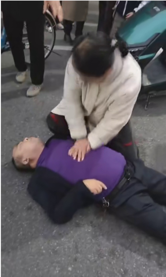 此时,一体型较胖的中年男子接到儿子后,骑着电瓶车在道路上行驶,忽然发生抽搐,一只脚乱蹬,头慢慢向右侧歪。此时,闫希和丈夫王东离该男子约两米远,这一幕恰好被她和丈夫看到。她没有丝毫犹豫,飞奔过来用手抱住男子的腰,丈夫王东也跑过来,两人合力将男子放在地上。