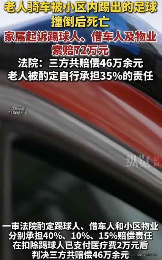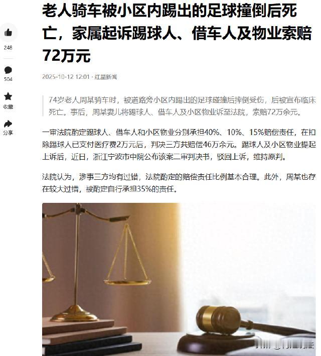浙江宁波,74岁的周大爷骑着借来的电动车载人,被小区广场上滚出的足球撞倒后,因为当时没有戴头盔伤势严重,一个多月后去世。家属起诉了踢球人裘某、借车人李某和小区物业,索赔72万,裘某带儿子踢球闯祸,这个责任到底该怎么划分呢? 据悉,裘某是个爱运动的父亲,平时只要有空,就会带着儿子出来踢一球。2024年6月17日晚上7点多,裘某正带着6岁的儿子踢球玩。 父子俩在广场上踢得正欢,裘某一脚大力抽射,足球直接穿过小区大门,滚到了旁边的马路上。 此时,74岁的周大爷正骑着从李某那借来的电动车,后座载着李某,慢悠悠地行驶在马路上。 周大爷是个很热心的老人,平时和李某关系不错,这次李某有事,便把电动车借给了周大爷,还搭了个顺风车。 周大爷骑的这辆电动车有些年头了,制动不太灵敏,存在一定安全隐患,可周大爷觉得骑了这么久也没出过事,就没太在意。 而且当时他也没戴头盔,觉得就一小段路,没必要那么麻烦。 当周大爷的电动车刚好驶到足球滚落的地方时,意外就在这时发生了。 足球猛地撞在电动车上,周大爷一时没反应过来,连人带车重重地摔倒在地。 后座的李某也吓了一跳,赶紧从车上下来查看情况。 裘某看到这一幕后,赶紧扔下手中的球,三步并作两步跑到周大爷身边。只见周大爷躺在地上,一动不动,情况看上去有点不好。 裘某跟着救护车把周大爷送去救治,裘某还主动垫付了2万元的治疗费,希望能尽自己的一份力。 然而,周大爷的伤势实在太重了,在ICU抢救了好几天,情况依然没有好转,医生建议转院 治 疗,于是周大爷又被转到了另一家 医 院。 在转 院 后的一个多月里,周大爷的家人日夜守候在他的病床前,期盼着他能醒来,最终周大爷还是因为闭合性 颅 脑 损 伤 特 重 型 而离 世。 周大爷的妻儿觉得,这场事故不能就这么算了,一定要有人为周大爷的死负责。 于是,周大爷的妻儿起诉了裘某、李某和小区物业一同告上了法庭,索赔72万余元。 周大爷的妻儿的诉求: 1,裘某带儿子在广场踢球,没有考虑到球可能会滚到路上危及他人安全,是导致事故的直接原因。 裘某也是一直不停地向周大爷的家人道歉,希望能得到他们的谅解。 2,李某把有安全隐患的电动车借给周大爷,还搭乘,也应该承担一定的责任。 李某觉得自己只是借了车,没想到会出这样的事。 3,而小区物业没有对公共区域的高风险活动进行提示或制止,没有尽到安全管理义务,同样有过错。 小区物业的代表也辩解称,他们已经在小区内张贴了安全提示,只是不可能时刻盯着每个人的行为。 那么,以法律的角度,这件事该如何认定和处理呢? 1,裘某带儿子在小区北门广场踢球,足球滚到马路上引发事故,这个行为该负什么责任呢? 从法律层面,裘某作为足球的直接控制者和管理者,在公共场所进行踢球活动时,有义务确保足球不会对他人的人身和财产安全造成威胁。 据《民法典》第1165条规定,行为人因过错侵害他人民事权益造成损害的,应当承担侵权责任。 裘某一脚大力抽射让足球冲到马路,明显没有尽到合理注意义务,对周大爷的摔倒受伤进而死亡存在重大过错,是导致事故的直接原因,不需要承担自己过失的责任。 2,李某把有安全隐患的电动车借给周大爷,自己还搭乘的行为,该承担什么责任呢? 根据《民法典》第1209条规定,因租赁、借用等情形机动车所有人、管理人与使用人不是同一人时,发生交通事故造成损害,属于该机动车一方责任的,由机动车使用人承担赔偿责任;机动车所有人、管理人对损害的发生有过错的,承担相应的赔偿责任。 李某明知电动车制动不灵敏存在安全隐患,还将车借出且搭乘,对事故发生有一定过错,需要承担过错内的责任。 3,小区物业对公共区域有安全管理义务,未尽到义务该承担哪些责任呢? 据《民法典》第942条规定,物业服务人应当按照约定和物业的使用性质,妥善维修、养护、清洁、绿化和经营管理物业服务区域内的业主共有部分,维护物业服务区域内的基本秩序,采取合理措施保护业主的人身、财产安全。 该小区北门广场是公共区域,物业虽张贴了安全提示,但未对高风险活动进行有效提示或制止,没有完全尽到安全管理义务,物业应该承担相应的责任。 4,判决结果: 最终,经过辩论和审理认定裘某存在重大过错,是导致事故的直接原因,需承担40%的赔偿责任,扣除已经垫付的2万元,还需赔偿27.7万元。 小区物业没有尽到安全管理义务,承担15%的责任,赔偿11.1万元。 借车的李某对事故发生有过错,承担10%的责任,赔偿7.4万元。 信源:2025-10-12 12:01 红星新闻