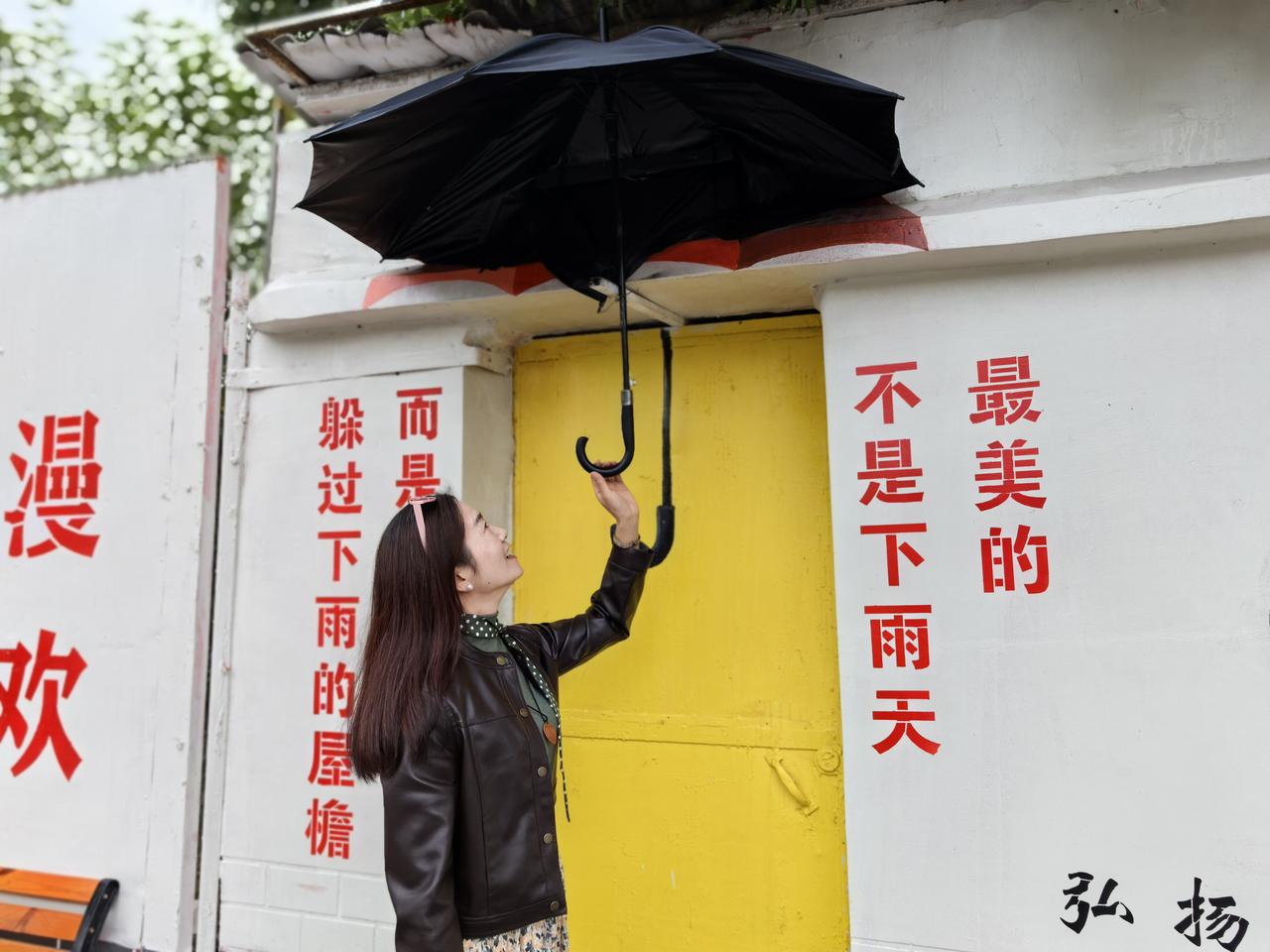 黄家社区网红墙引来民众打卡 刷抖音刷到一个拍照非常出片的宝藏地,赶紧约上我介绍过的我的“旅游搭子”去打卡。 骑着电动车,按照高德地图导航到了江山路黄家社区,停好车,就开始找网友们拍照的地方。 最开始还是挺失望的,以为自己又被抖音骗来的,不就是黄家社区居委会门前的半条街一面墙嘛。 结果等我们还没有走到近处,就见一群退休的大姐姐们在排队拍照录制视频,她们带的东西可真齐全啊,手机拍照稳定器、蓝牙音箱、各种纱巾、帽子头饰,于是我们在旁边等待,欣赏大姐姐们的出片方式。 整面墙展示的有以下几个板块: 时间轮回仓、正能量的提示语学习雷锋好榜样绘图是雷锋同志帮助民众做好事、火爆电影哪吒和他师傅的图片、立体感的粉色熊、祈祷墙、美女凹凸大头像等。 最喜欢的一句话就是:最美的不是下雨天,而是和你一起躲过下雨的屋檐。真的好想知道,这是哪位设计师想出来的这么有意思的构图,一面再普通不过的围墙,让它华丽转身,闪闪发光,变废为宝啦! 不得不说,艺术来源于生活,绘画艺术作品让人流连忘返,带来精神上的愉悦和感官上的享受。为扮靓黄家社区这面墙的艺术大师点赞!