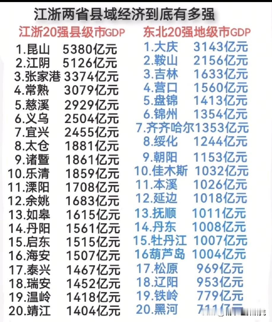 江浙(江苏和浙江)GDP前二十强县级城市与东北GDP前二十强地级城市经济数据对比