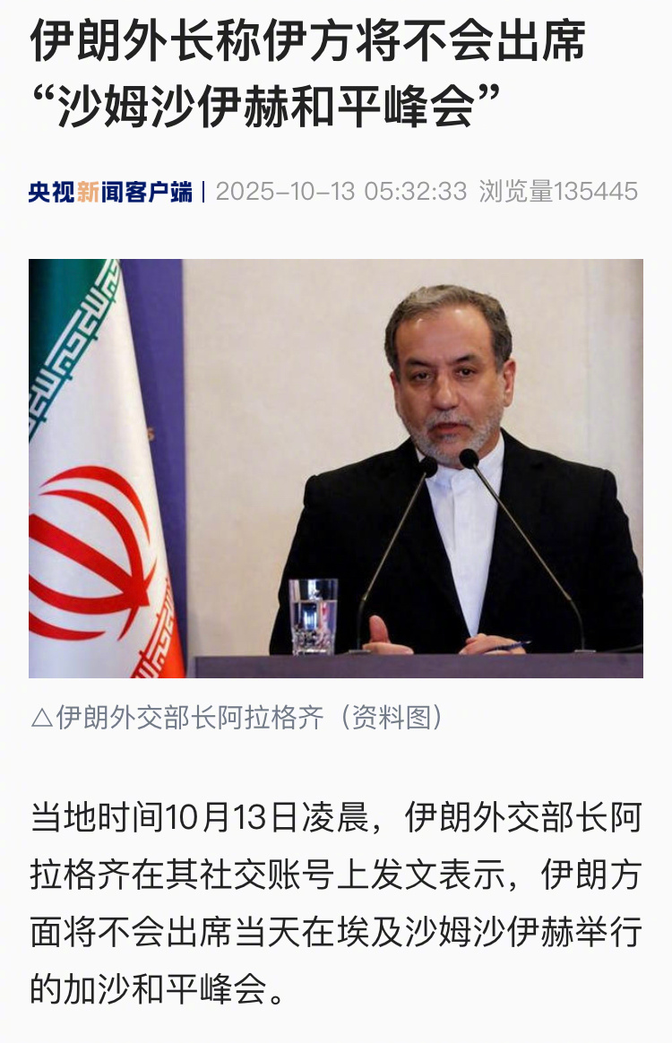 【伊朗外长称伊方将不会出席“沙姆沙伊赫和平峰会”】当地时间10月13日凌晨,伊朗外交部长阿拉格齐在其社交账号上发文表示,伊朗方面将不会出席当天在埃及沙姆沙伊赫举行的加沙和平峰会。#伊朗不会出席加沙和平峰会#