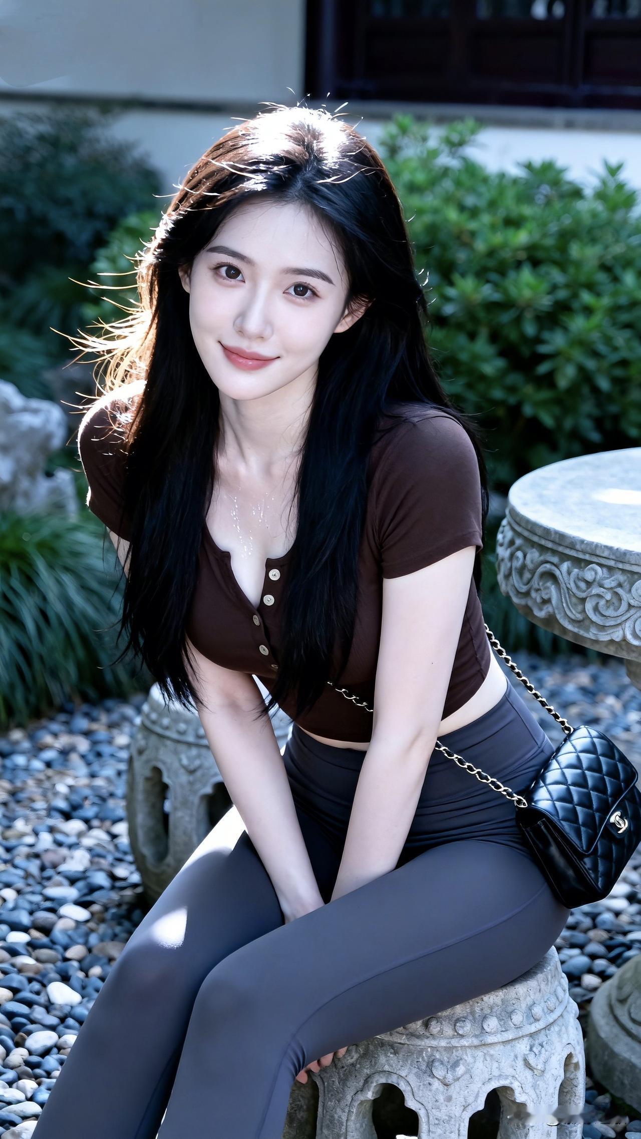 《晴园遇》 晴光碎落石苔间,柳鬓风梳意自闲。 香汗微凝沾素颈,嫣然一笑动春山。 《石凳幽》 石凳幽园傍浅流,绿萝青石两悠悠。 棕衫衬得腰肢软,笑靥如花色更稠。 《园居晓》 晨光初透绿窗纱,露湿青阶印浅霞。 素手轻拢云鬓乱,风牵衣袂落松花。 石栏倚遍听莺语,竹影横斜映碧纱。 此境悠然谁共赏,眉间心上总无瑕。 花影摇曳间 亭前花影