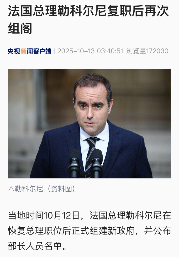 勒科尔尼在10日晚间被马克龙再次任命为总理,并负责组建新一届政府。此前,他于9月9日首次被马克龙任命为总理,10月5日组阁,10月6日向马克龙请辞。(央视新闻)