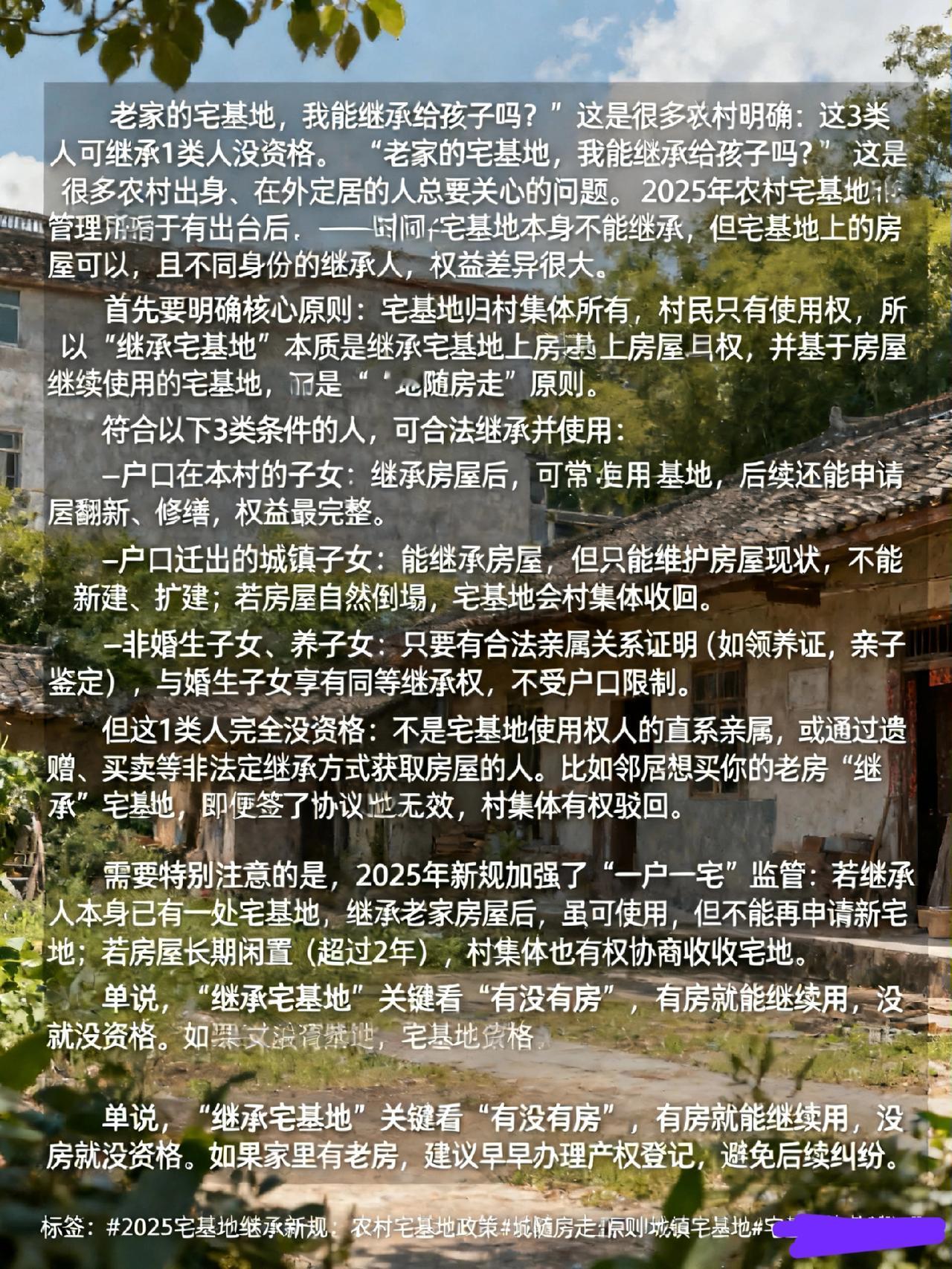 农村宅基地能继承吗?2025年新规明确:这3类人可继承,1类人没资格 “老家的宅基地,我能继承给孩子吗?”这是很多农村出身、在外定居的人最关心的问题。2025年农村宅基地管理新规出台后,这一问题终于有了清晰答案——宅基地本身不能继承,但宅基地上的房屋可以,且不同身份的继承人,权益差异很大。 首先要明确核心原则:宅基地归村集体所有,村民只有使用权,所以“继承宅基地”本质是继承宅基地上房屋的所有权,并基于房屋继续使用宅基地,这就是“地随房走”原则。 符合以下3类条件的人,可合法继承并使用: - 户口在本村的子女:继承房屋后,可正常使用宅基地,后续还能申请房屋翻新、修缮,权益最完整。 - 户口迁出的城镇子女:能继承房屋,但只能维护房屋现状,不能新建、扩建;若房屋自然倒塌,宅基地会被村集体收回。 - 非婚生子女、养子女:只要有合法亲属关系证明(如领养证、亲子鉴定),与婚生子女享有同等继承权,不受户口限制。 但这1类人完全没资格:不是宅基地使用权人的直系亲属,或通过遗赠、买卖等非法定继承方式获取房屋的人。比如邻居想买你的老房“继承”宅基地,即便签了协议也无效,村集体有权驳回。 需要特别注意的是,2025年新规加强了“一户一宅”监管:若继承人本身已有一处宅基地,继承老家房屋后,虽可使用,但不能再申请新宅基地;若房屋长期闲置(超过2年),村集体也有权协商收回宅基地。 简单说,“继承宅基地”关键看“有没有房”,有房就能继续用,没房就没资格。如果家里有老房,建议尽早办理产权登记,避免后续纠纷。 标签:2025宅基地继承新规 农村宅基地政策 地随房走原则 城镇子女继承宅基地 宅基地资格认定 宅基地新规 宅基地新政 宅基地申请标准