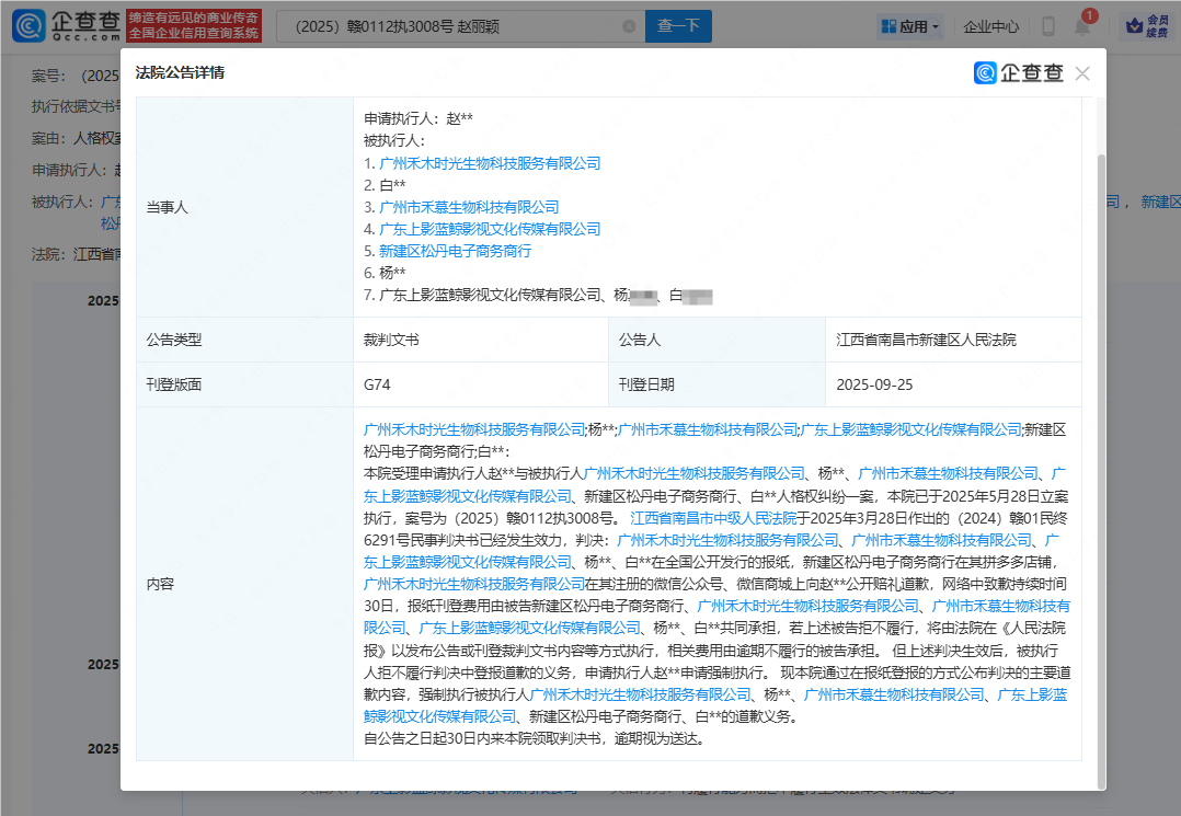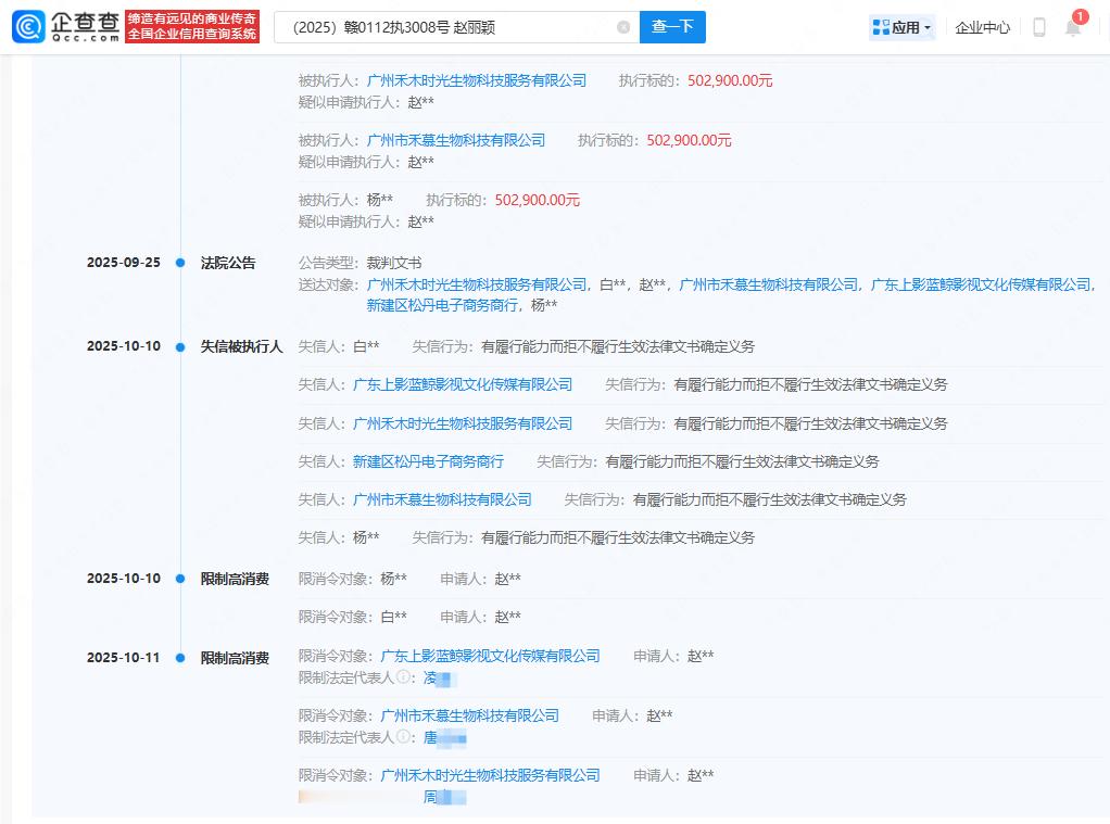 【赵丽颖维权最新进展】赵丽颖方申请限消多个侵权方企查查APP显示,近日,赵丽颖起诉广州禾木时光生物科技服务有限公司、白某某、赵某某、广州市禾慕生物科技有限公司、广东上影蓝鲸影视文化传媒有限公司等人格权纠纷案件更新,多个被告主体因有履行能力而拒不履行生效法律文书确定义务被法院列为失信被执行人(老赖)。同时,赵丽颖方申请对杨某某、白某某,广东上影蓝鲸影视文化传媒、广州市禾慕生物科技等公司及其法定代表人限制高消费。案件流程显示,此前被告已因此案被强制执行50余万元。