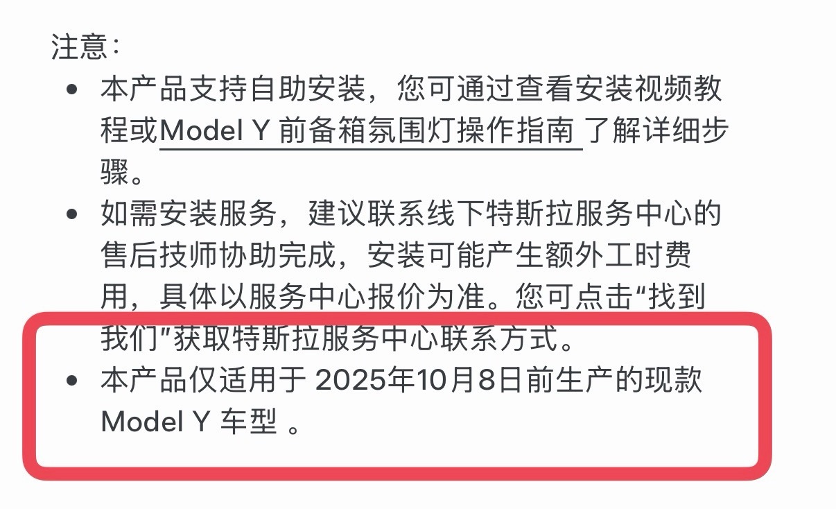 在特斯拉商城,Model Y前备箱氛围灯标注:仅适用于2025年10月8日前生产的现款Model Y车型。