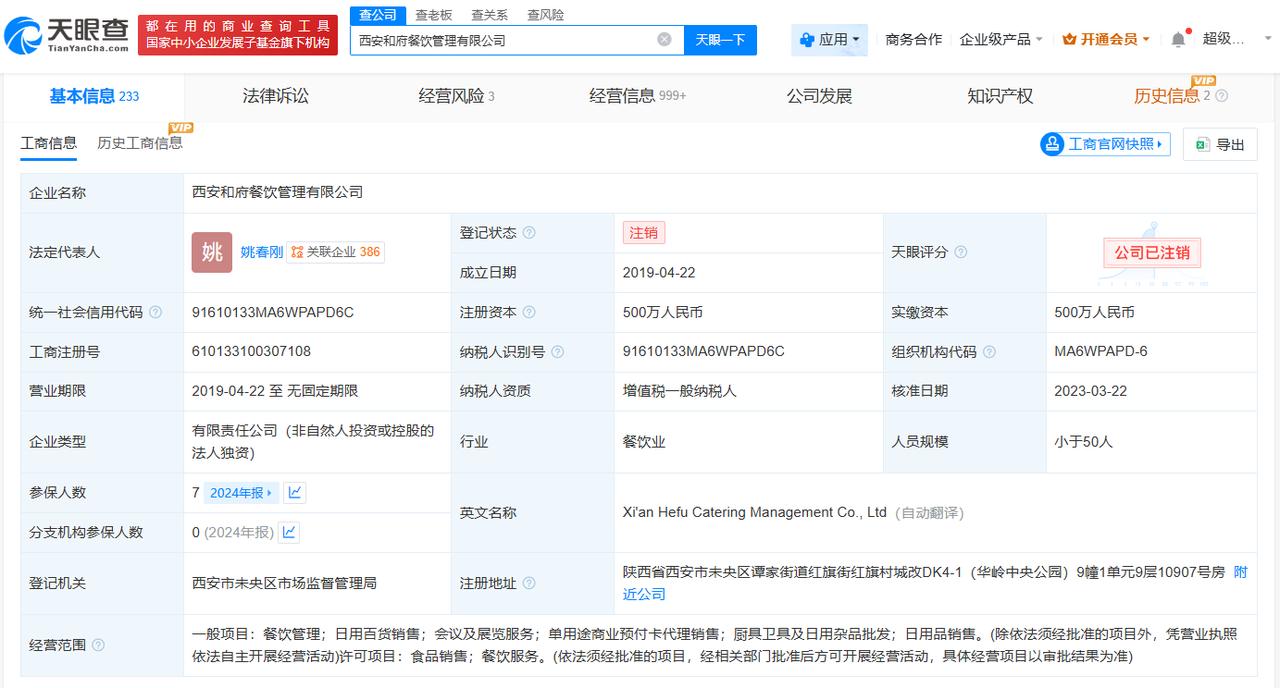 天眼查App显示,近日,西安和府餐饮管理有限公司登记状态变更为注销。此前,该公司