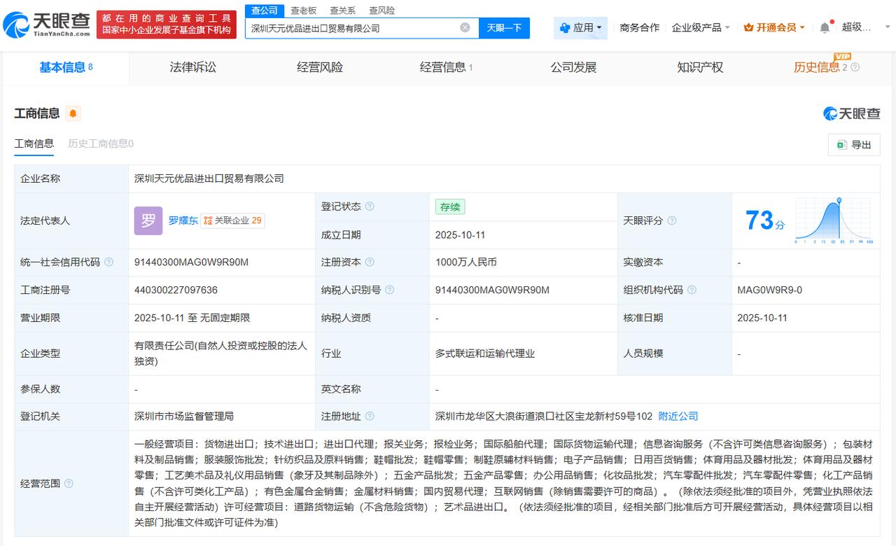 注册资本1000万人民币 天眼查App显示,近日,深圳天元优品进出口贸易有限公司