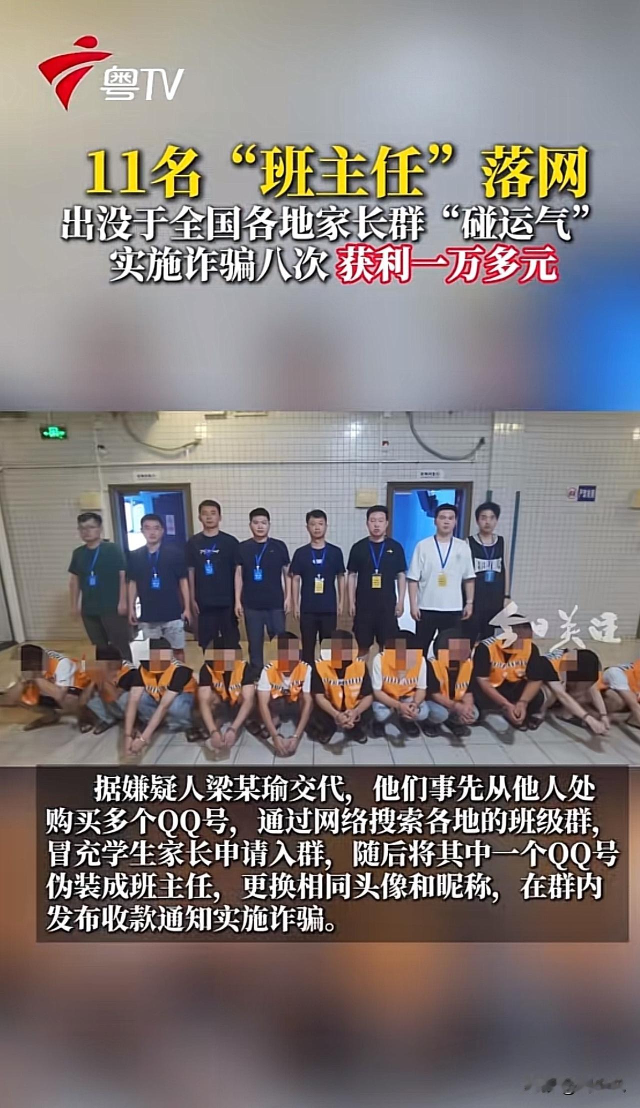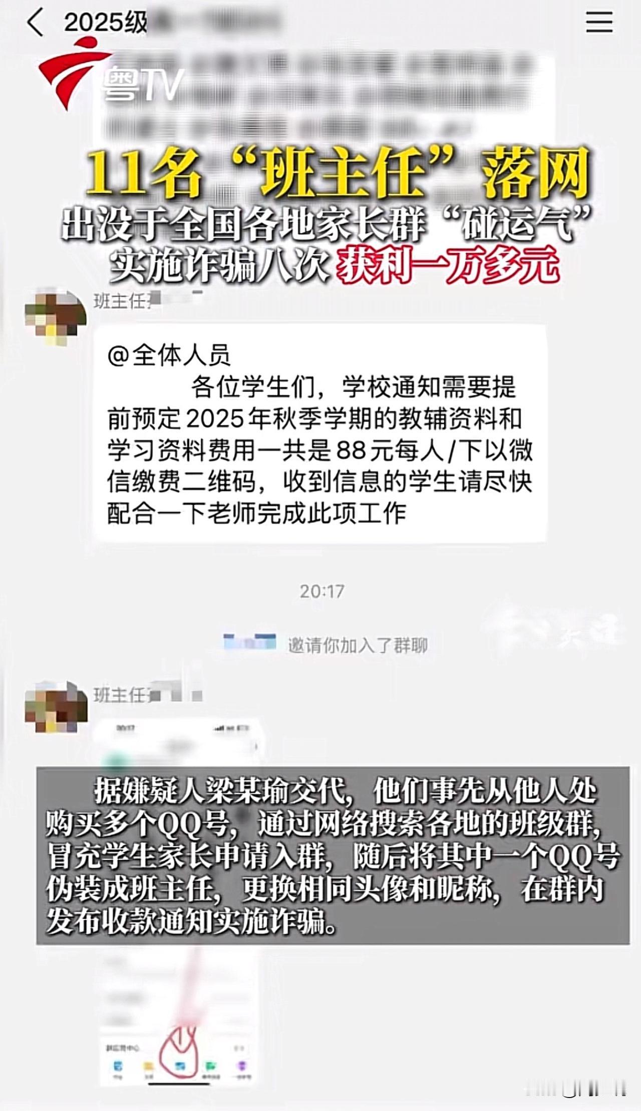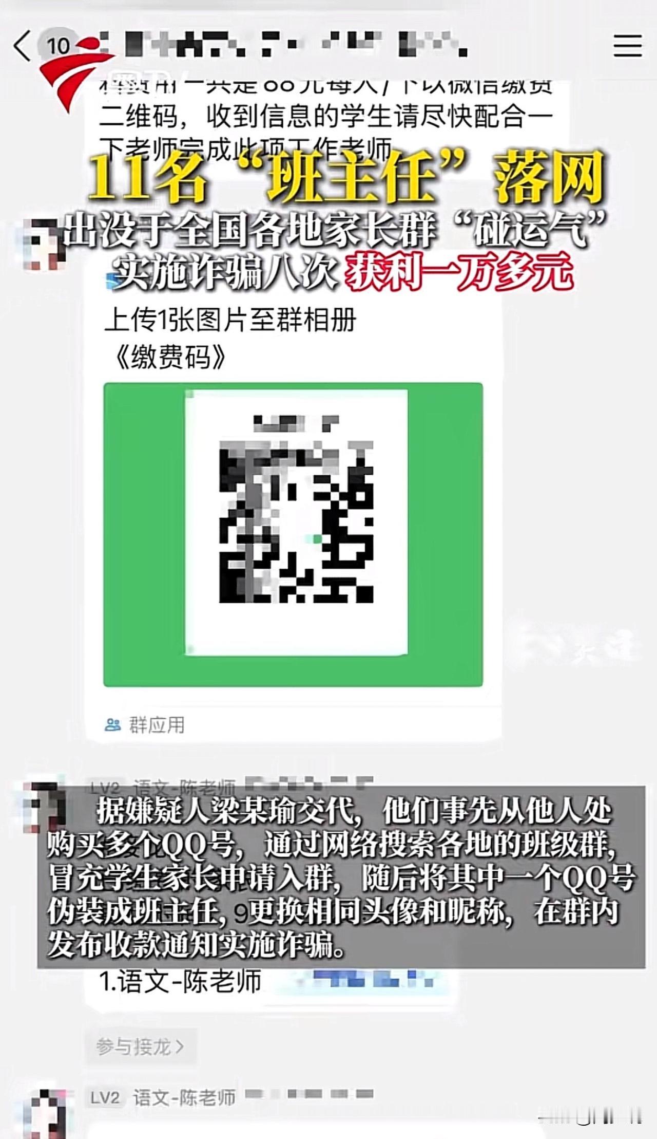 “太给力了!”合肥警方成功抓获11名假班主任,令众多网友纷纷称赞! 据悉,合肥经开区多名家长遭遇“班级群”诈骗,骗子混入学校QQ群,伪装成班主任,更换相同头像和昵称,要求家长扫码缴纳资料费。 合肥警方经过缜密侦查,跨省千里追击,成功打掉这一电信网络诈骗团伙,11名涉案人员全部落网。 这件事周少觉得真给大家提了个醒,骗子手段越来越隐蔽,家长群需提高警惕,设置进群验证,不轻易扫码转账。 另外,不得不说这些骗子真可恶,竟然把苗头指向家长,属实让人气愤。这下好了,成功被抓获,法网恢恢,疏而不漏,必须严惩。 对于这样的情况,大家身边有被骗的经历吗?#寻美三湘# #长沙新朋友#