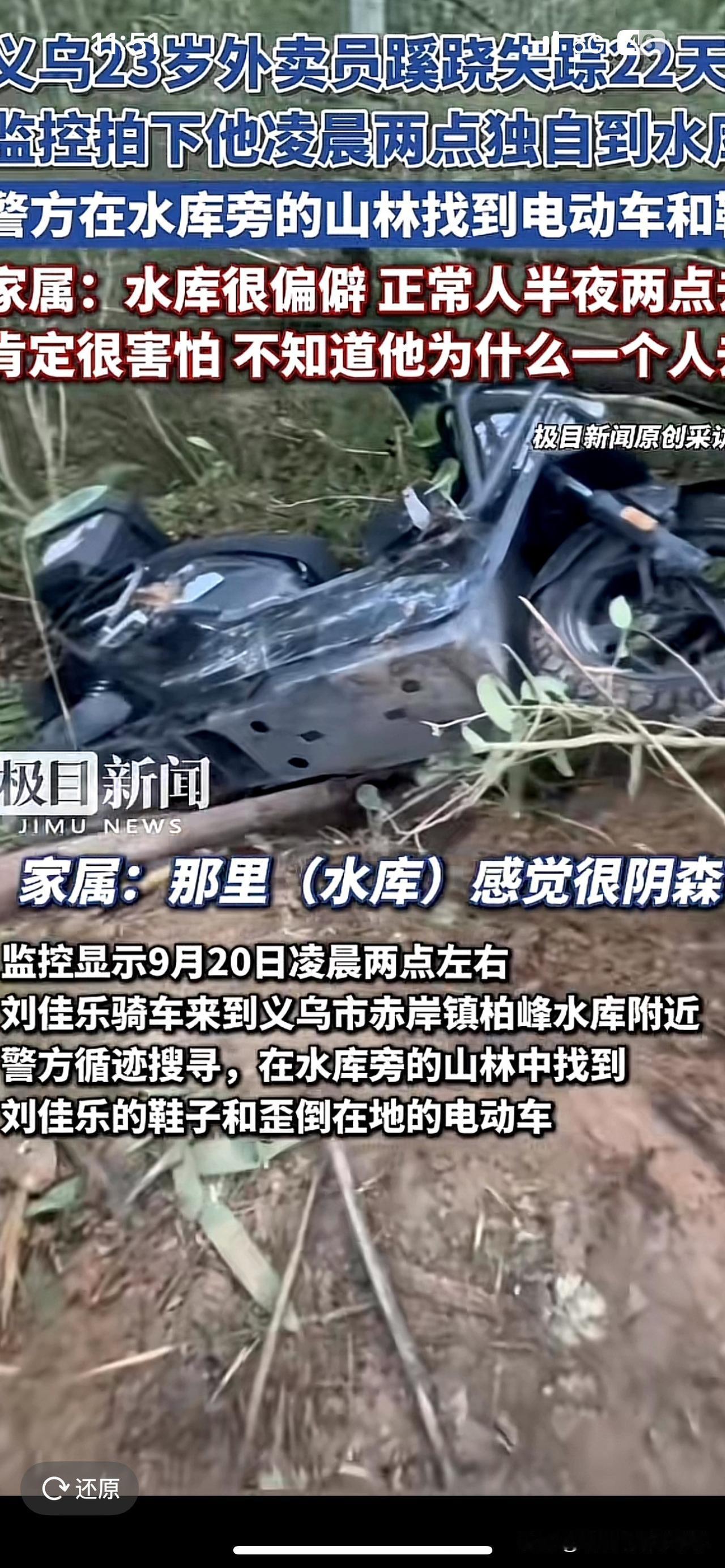 可怜,这个谜何时能破解 浙江义乌二十三岁外卖员刘佳乐已经失联二十二天了,他到底发生了怎样不为人知的秘密,父母整天以泪洗面,是怎样的撕心裂肺 这个男孩最后的身影出现在凌晨二点十三分一个水库边!九月二十号监控拍的,附近有他的鞋子和电动车, 男孩的父亲说他们是江西玉山县人,他来浙江送外卖已经二年的时间,不知道什么原因他深夜去那里干什么!是有什么事想不开吗?还是压力大听到父亲的讲述更让人感到担忧! 正常人绝对不会深夜二点独自前往,水库离住的地方有二十多公里,道路蜿蜒曲折,一片阴森 他随身带的雨伞和书包也消失不见!人不知所踪,想想让人感到细思极恐!如果是落水失足,他的鞋子为什么落到了岸边,其他物品却消失的干干净净 警方和当地媒体组织人员在水库和山里搜寻,救援队也用了专业的设备在水库里探测 但是至今没有任何消息! 到今天为止男孩已经丢失二十二天了,社会不安全了,真的是像鬼故事里的科幻片一样充满了诡异!只知道家里人是怎样撕心裂肺!如果大家有任何相关信息请帮忙与警方和家属联系!