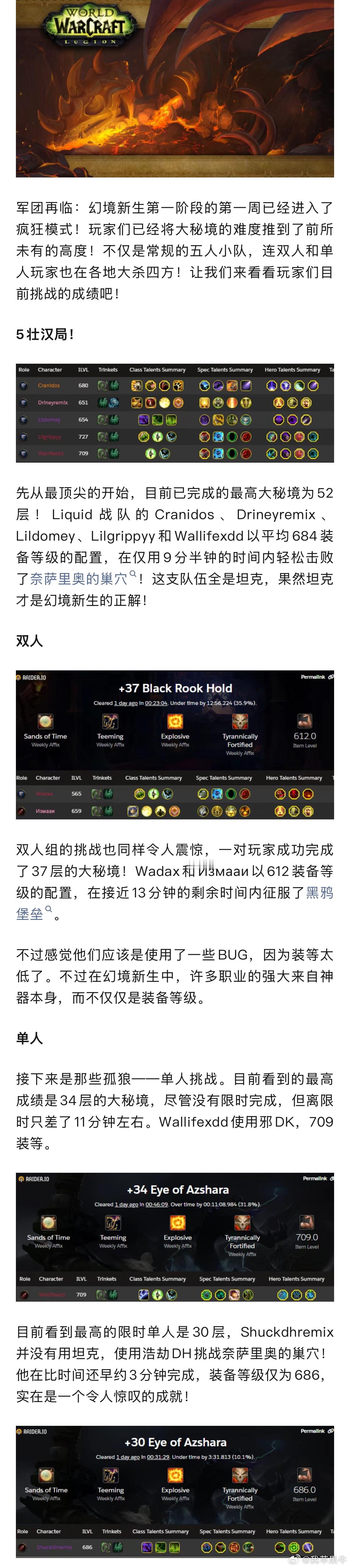 军团再临:幻境新生第一阶段的第一周已经进入了疯狂模式!玩家们已经将大秘境的难度推到了前所未有的高度!玩家单刷34层大秘境!职业选手5T阵容9分钟打完52层!