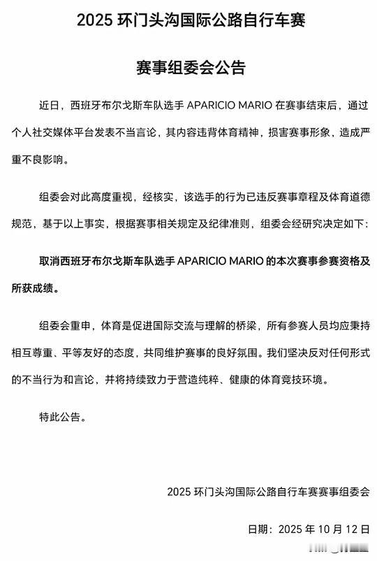 将中国国旗和猪放在一起,这就是吃我们喝我们,然后骂娘! 事情是:西班牙布尔戈斯车队选手马里奥 - 阿帕里西奥,在2025年10月12日北京环门头沟国际公路自行车赛,完赛后分享成绩时,将一头猪和中国国旗放在一起。 10月13日,赛事组委会发布公告,取消他的本次赛事参赛资格及所获成绩,并对其言论进行了谴责。 目前马里奥并未道歉! 我们欢迎五洲宾朋,但来到中国,应该对这个国家和人民有最起码的尊重! 就拿此事而言,中国和西班牙的风俗习惯再不同,这也是侮辱性的表述,也不能简单的一句风俗习惯不同糊弄过去吧?