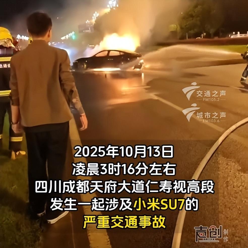 凌晨三点的天府大道,火光比路灯还亮 —— 小米 SU7 翻着滚撞向绿化带,20 分钟就成了黑黢黢的车架,驾驶员没来得及逃出来。 10 月 13 日这起事故,行车记录仪拍得扎心:SU7 先在路上晃悠,等红灯时能听见驾驶员吼叫,接着就以超 150 码的速度冲出去。疑似躲右转车时失控,撞完绿化带又翻去对向车道,火一下就窜起来了。路人冲上去救,手肘撞、石头砸,有人手指被玻璃划得冒血,灭火器喷得手酸,车门还是纹丝不动。 消防来后用水枪压火,再用电锯割车身,可驾驶员早没了气息。小米客服只说 “暂未获取信息”,可它的销量多亮眼啊 —— 去年卖 13 万多辆,今年前九月冲 26 万,Yu7 一天卖几十万,风头正盛。 谁都知道超速是主因,可 “撞后车门打不开” 的坎绕不过去。业内人说可能是线束断了,可新能源车要保 5 分钟不起火,门打不开,再多时间也白搭。 至今警方还在查,消防等通报,小米没新回应。销量能冲榜,安全不能 “等通报”—— 每辆车上路,都该带着能打开的门,而不是让路人的血、家属的泪,成了流量里的注脚。