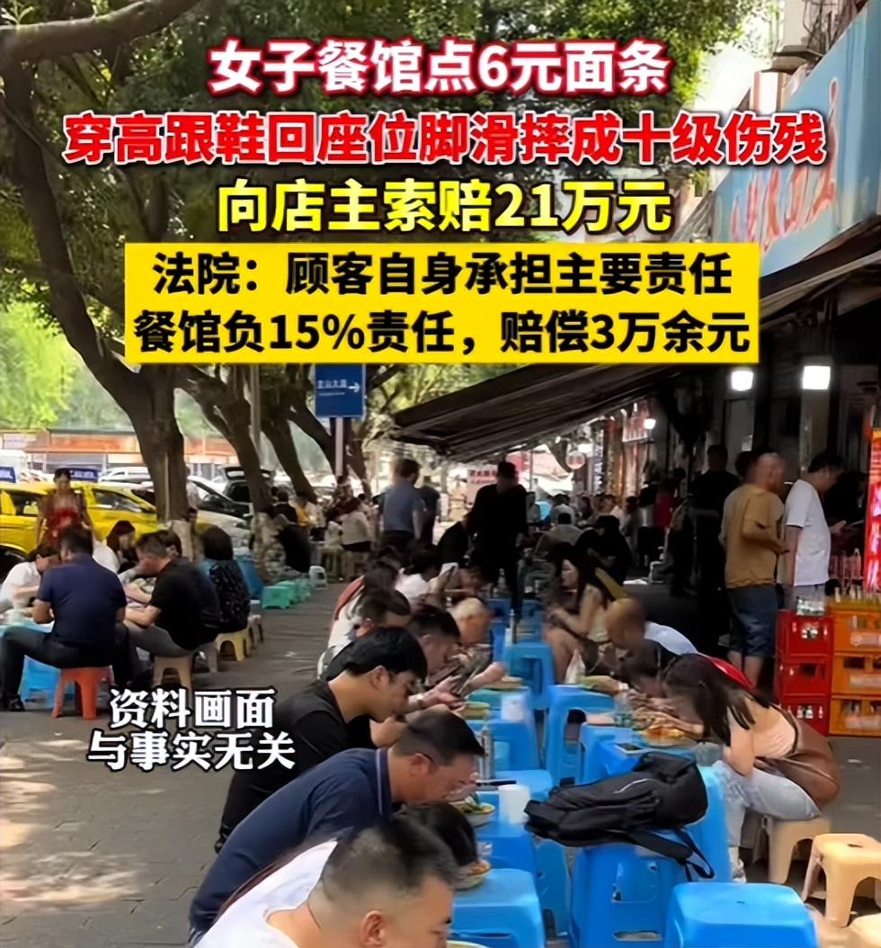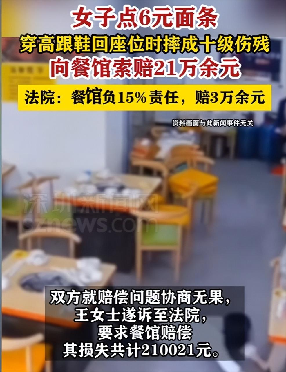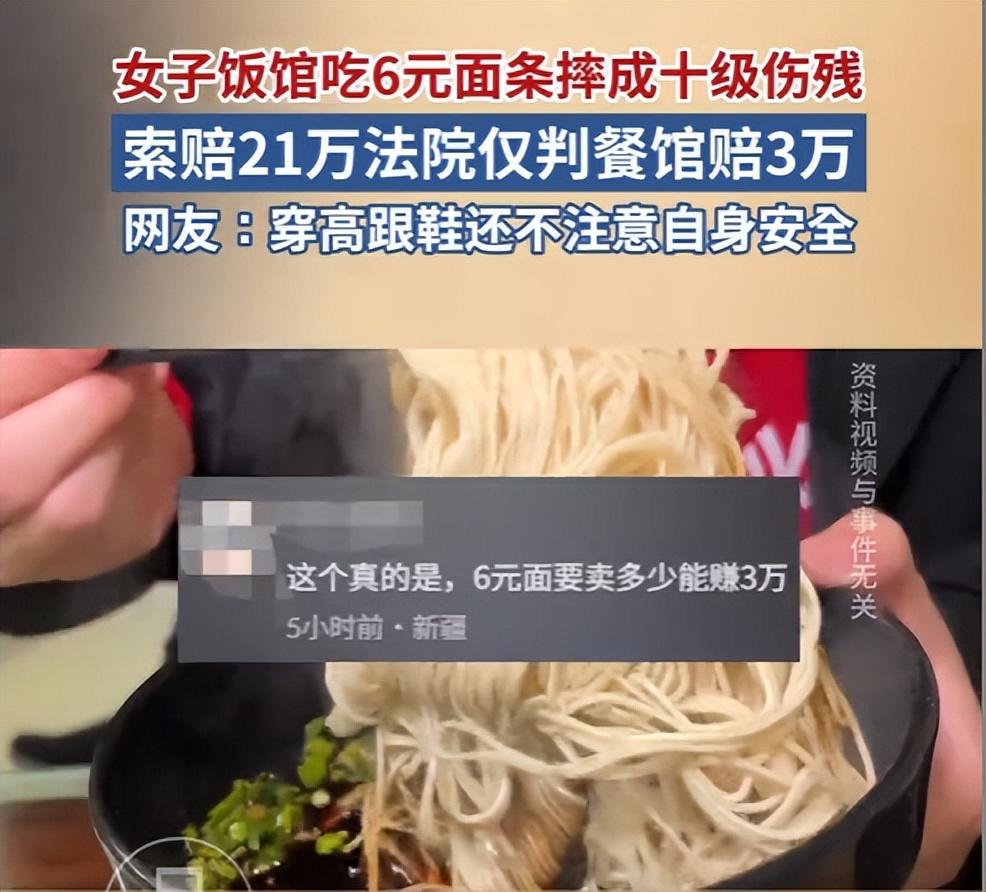6 元猪油拌面刚嗦两口,21 万索赔单就拍在了岳阳小餐馆老板面前 —— 常客刘玲踩着 7 厘米细跟高跟鞋,在自己熟得能闭着眼走的台阶上摔了一跤,左髌骨骨折后,竟拿着伤残鉴定把餐馆告了,张口就要抵老板好几年净利润的赔偿。 监控拍得明明白白:餐馆台阶铺了防滑砖,墙角贴着 “小心地滑” 警示牌,当天地面连滴面汤油渍都没有。几十位食客来来往往,证人当庭说 “走哪儿都稳”,就她踩着细跟急匆匆冲,连自己每周来三四次的店、天天经过的台阶都没多看一眼。 老板更冤:见她摔了,第一时间喊救护车、垫付医药费,事后主动协商,可刘玲上来就狮子大开口,把误工费、精神损失费全算成餐馆的 “债”。小餐馆本就靠一碗面赚几毛钱活命,食材租金压得喘不过气,这哪是索赔,是把自己的 “疏忽” 当摇钱树。 法院最终判了:刘玲自担 85% 责任,餐馆因台阶未加防滑条赔 3 万多。没人上诉。 一碗面的烟火气,终究喂不饱贪婪。自己踩不稳高跟摔了,别把餐馆的安全保障当 “提款机”—— 这吃相,比摔在地上还难看。