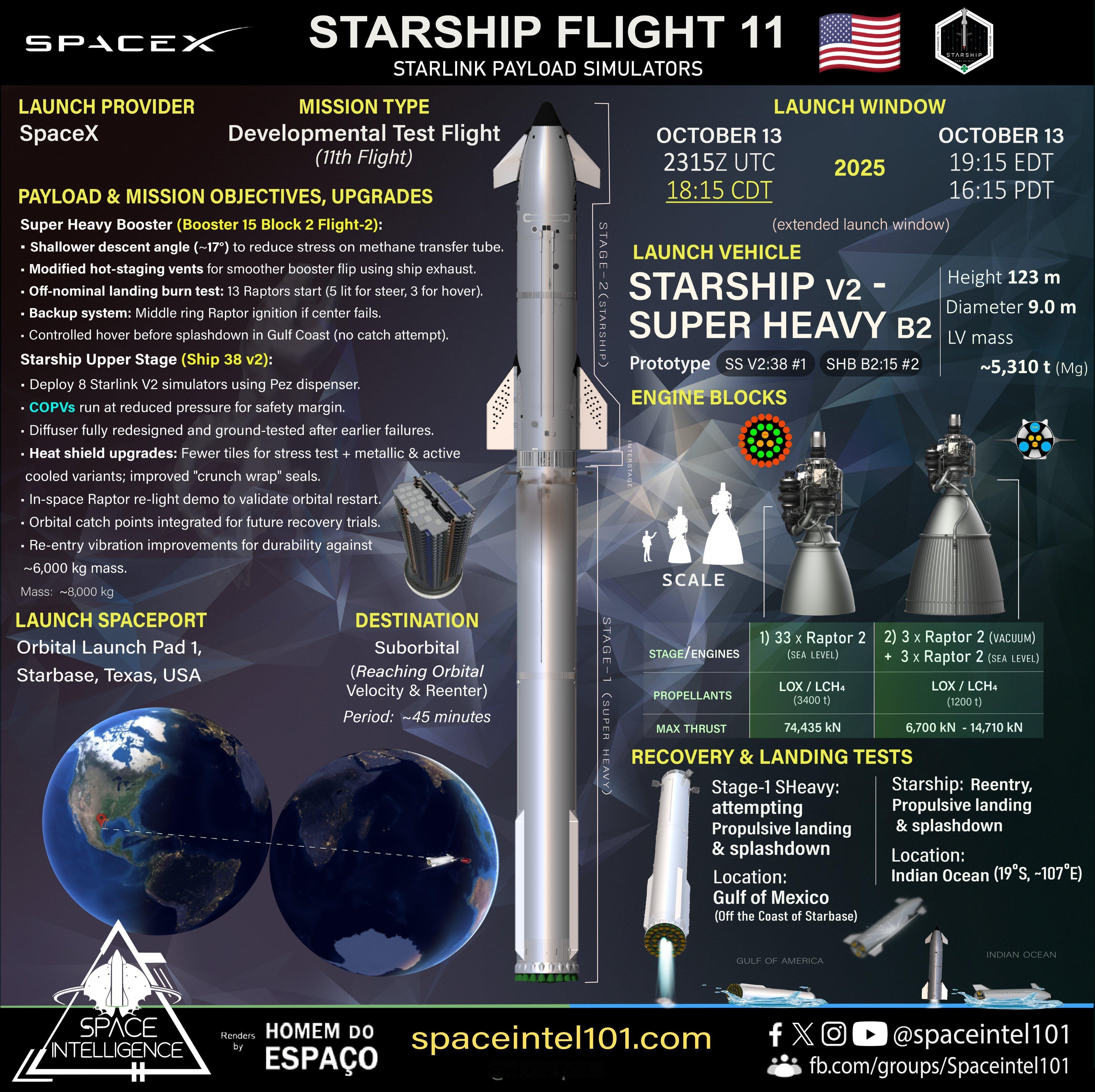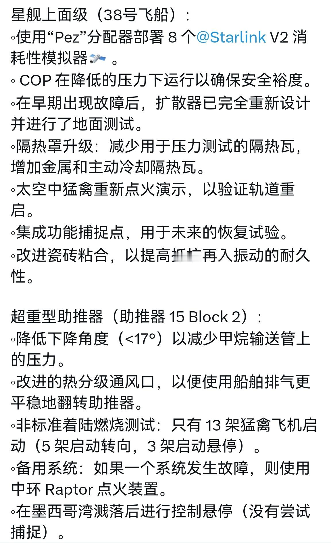 🔻此次主要测试模拟星链载荷释放,太空星舰重点火,助推器回收海上溅落,关闭部分发动机进行模拟故障压力测试。