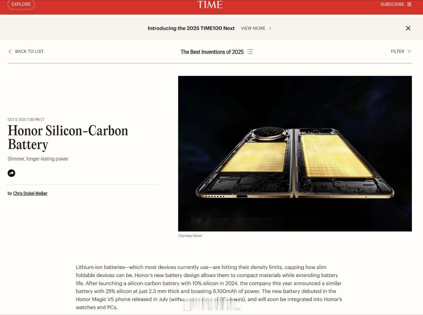 近日,《时代周刊》公布2025年“最佳发明”榜单,荣耀凭借“青海湖刀片电池”与“