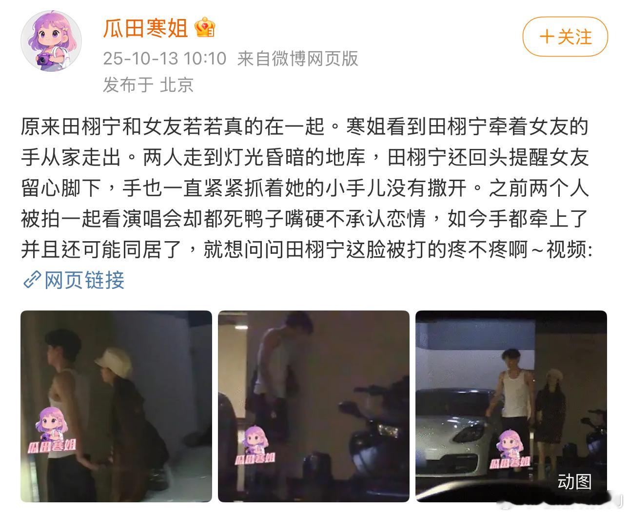 7月份义正辞严的发布单身声明的田栩宁,被拍到和若若9月15号甜蜜牵手。田栩宁若若牵手