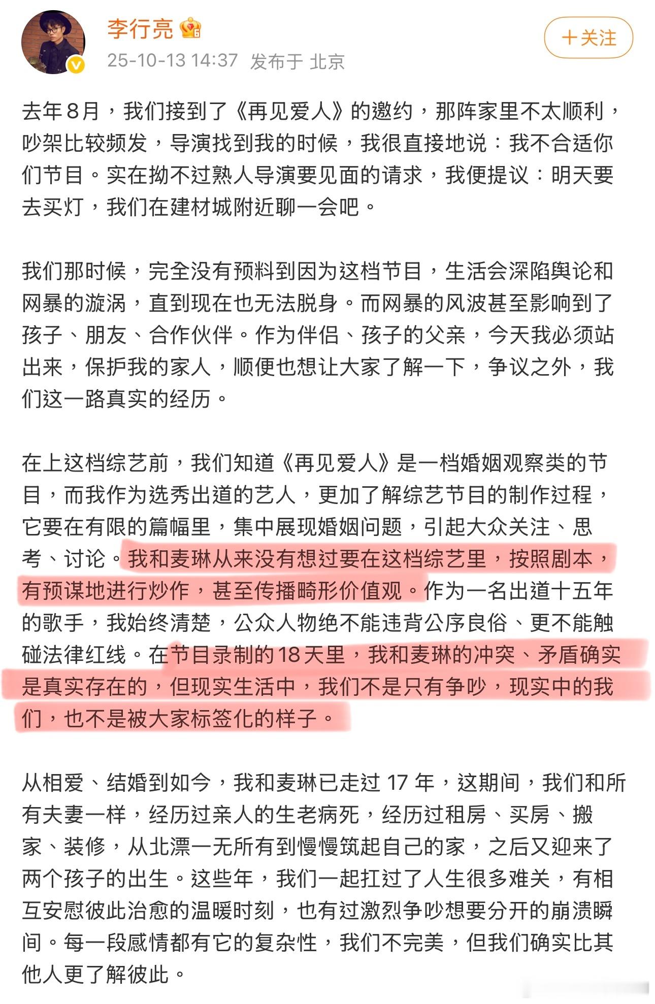李行亮发微博长文维权李行亮回应《再见爱人》争议了: