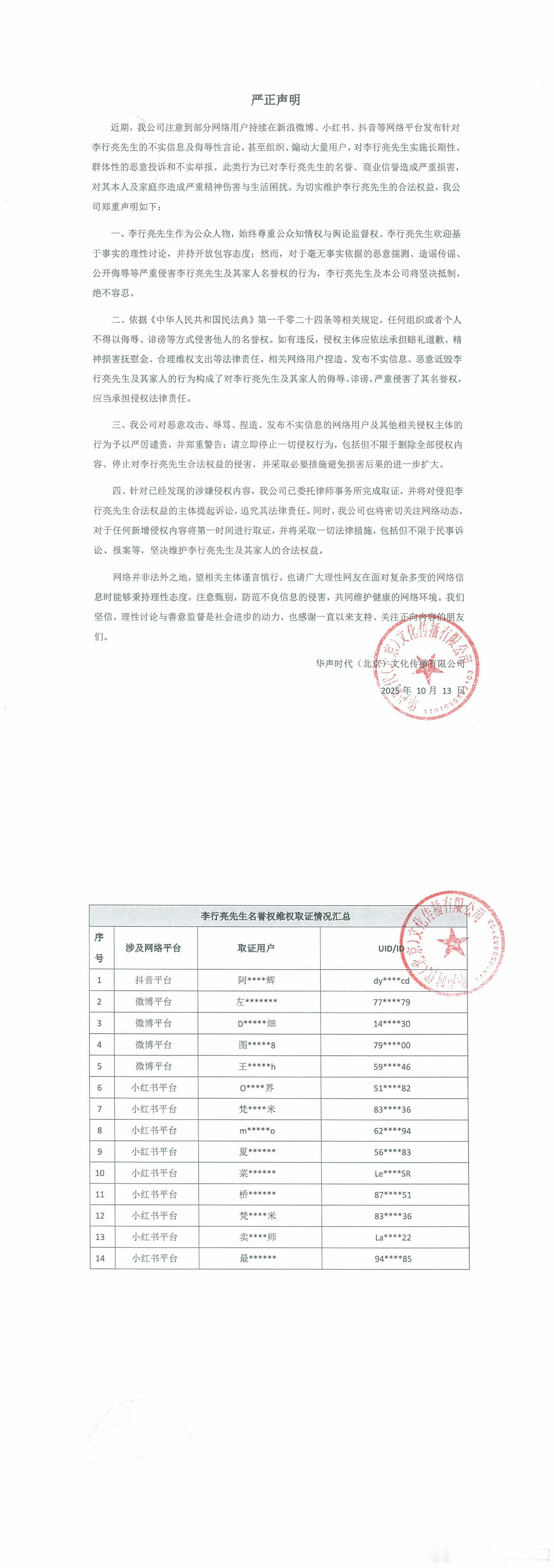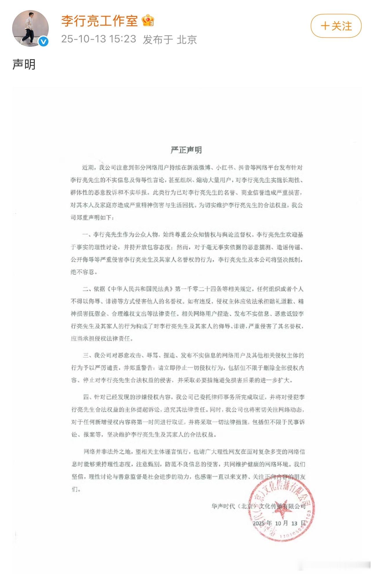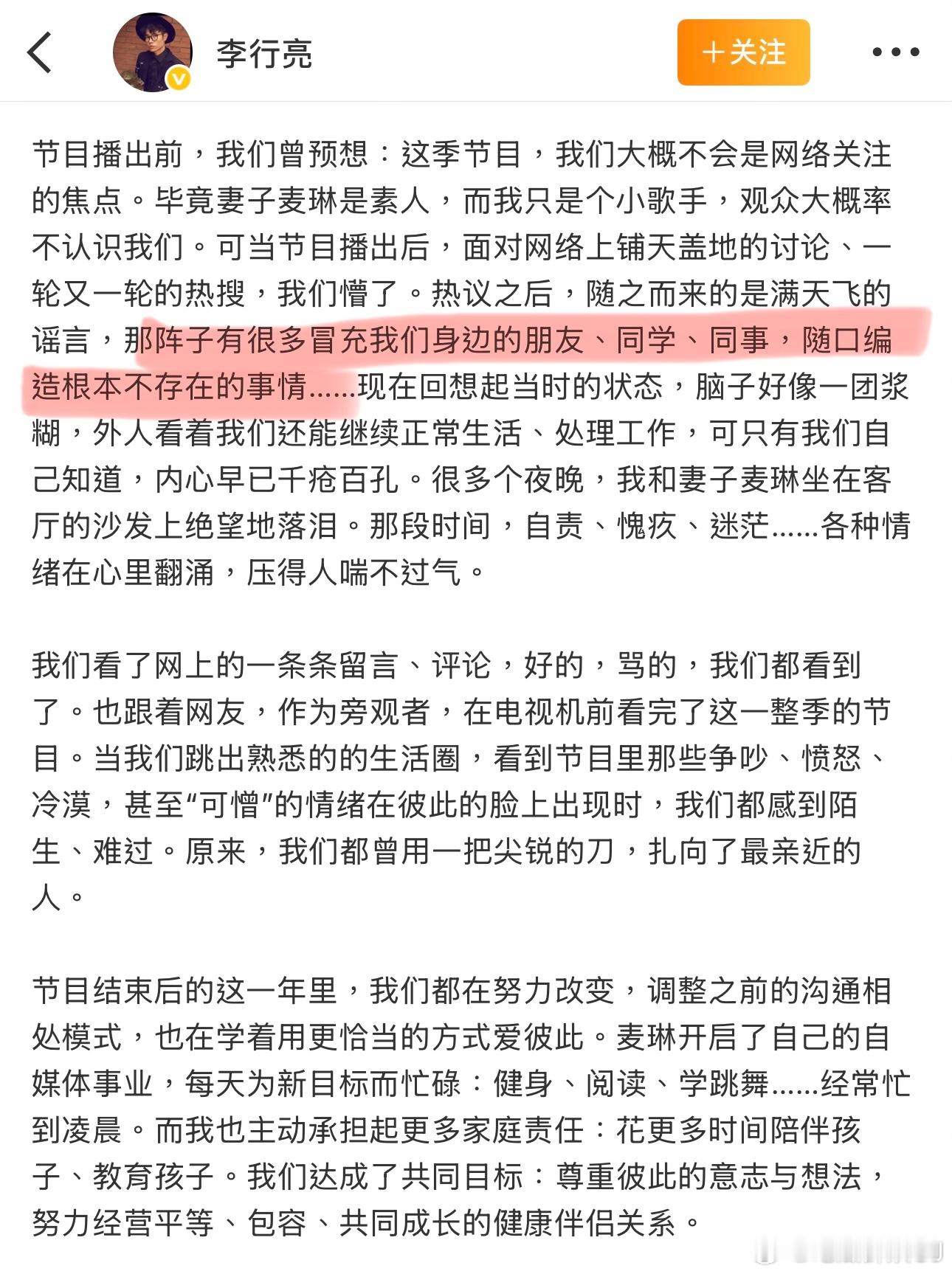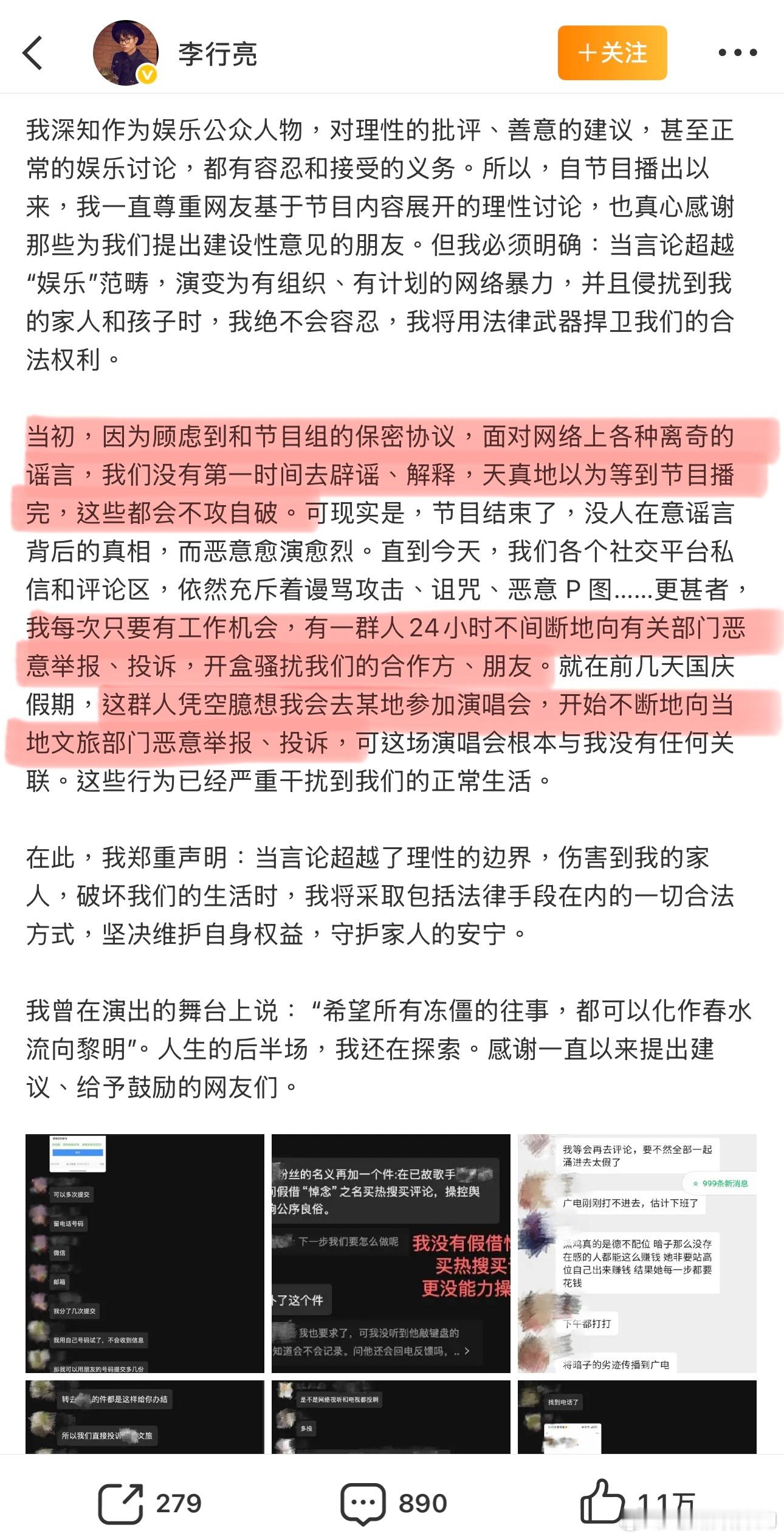这一年时间里,身为当事人的李行亮和麦琳调整了相处沟通模式,也积极向上让自己变得更好。但始终有一部分人带着恶意看待他们夫妇,李行亮只要有工作机会就会被这群人24小时不间断地举报、投诉,连他们身边的朋友包括合作方都被开盒骚扰。近期有场根本和李行亮无关的演唱会也被黑粉恶意投诉举报,这都严重影响了李行亮麦琳及其身边人的正常生活,所以他要站出来回应反击,李行亮工作室也发布了告黑声明。