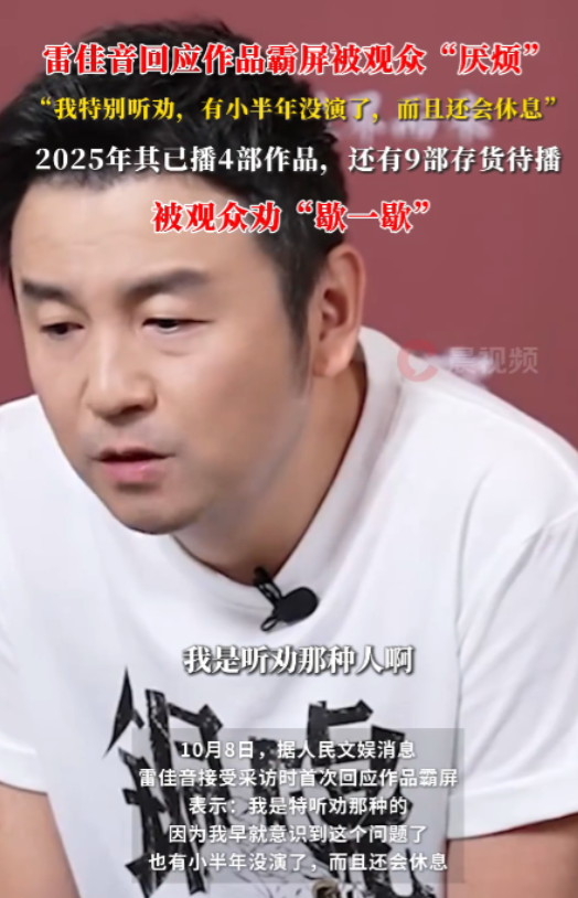 演员分两种:要么没戏拍,要么拍到烦。 像雷佳音,今年光主演的戏就上了四部,打开电视哪儿都是他。观众吐槽他角色太像“窝里横的中年男人”,连官媒都点评“怎么老是你”。