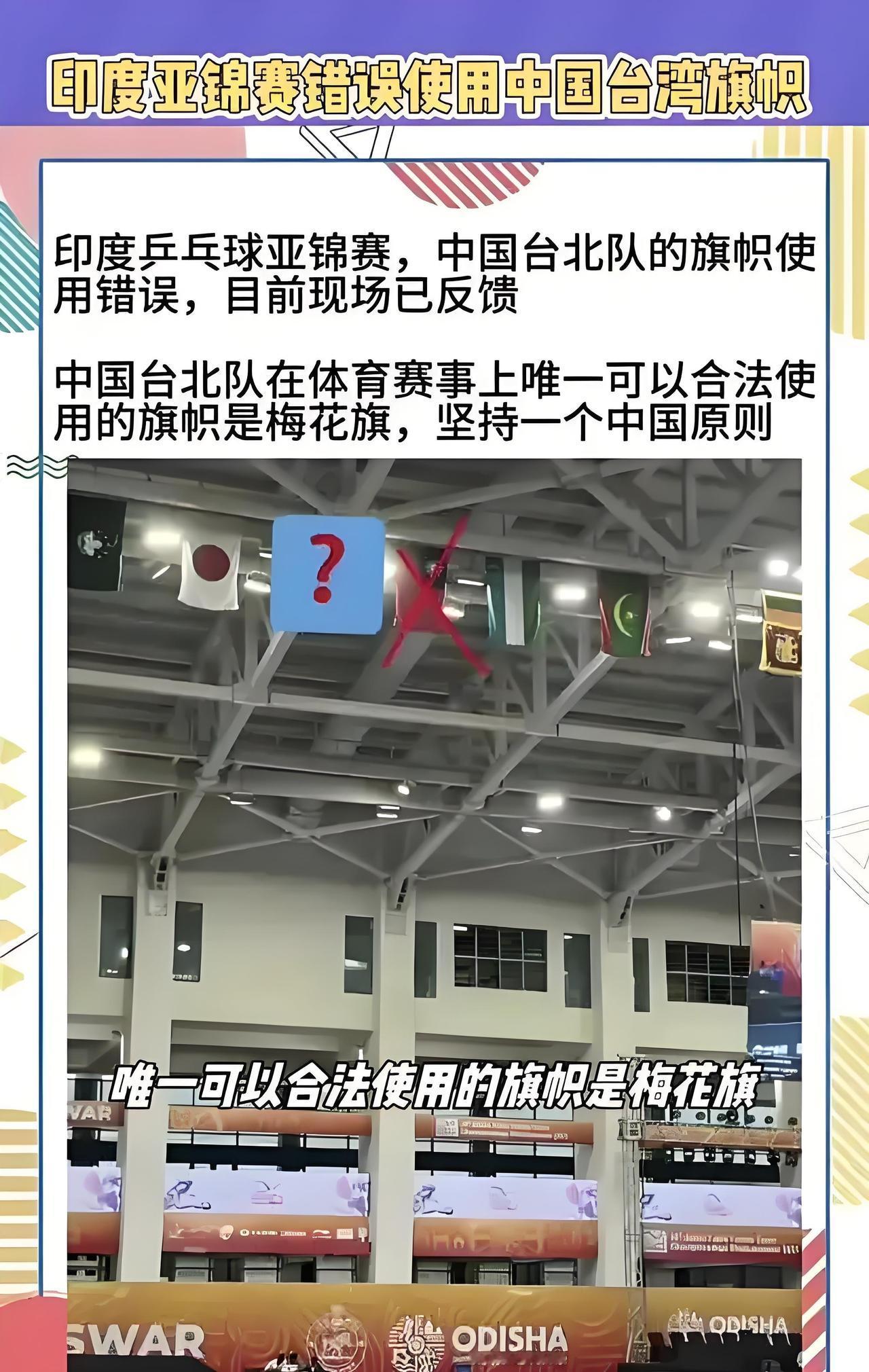 撤下伪旗,捍卫原则!中国代表团果断行动彰显国家尊严! 最近在印度举办的2025年亚洲乒乓球团体锦标赛上,发生了一件让人气愤的事。比赛现场居然错误悬挂了台湾地区的伪旗,中国参赛代表团发现后,第一时间向主办方提出严正交涉。好在当天,主办方就撤下了那面不该出现的旗帜。这件事虽然解决了,但背后的问题值得我们深思。 这种错误悬挂伪旗的行为,绝不是小事!台湾是中国的一部分,一个中国原则是国际社会普遍认同的基本准则,任何试图通过体育赛事搞政治操弄的把戏,都是对这项原则的严重挑衅。台湾当局这种借机“刷存在感”的行为,不仅破坏了体育比赛的纯粹性,还扰乱了赛场秩序,简直让人不齿!体育本是增进友谊的平台,却被一些人拿来搞分裂,这种行径注定失败,也绝不会得逞。中国代表团的迅速反应,展现了我们维护国家主权和领土完整的坚定决心,值得点赞! 这次事件再次提醒我们,维护国家统一和尊严是每个人的责任。无论在哪里,中国的声音和立场都必须被尊重。让我们共同支持一个中国原则,为祖国的团结强大发声!你怎么看这件事?欢迎在评论区分享你的观点!
