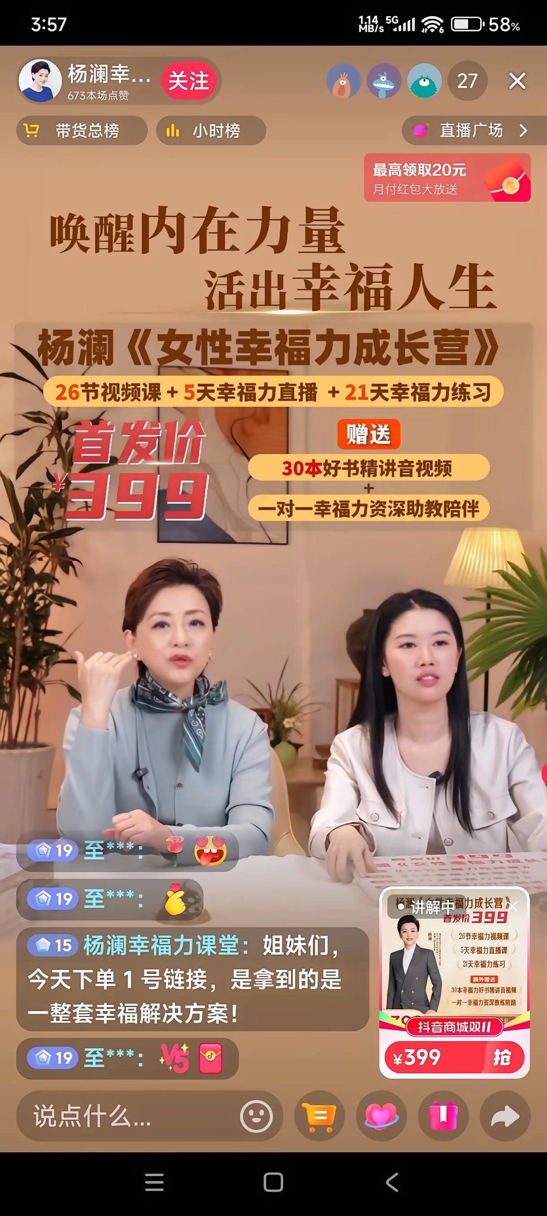 杨澜昨天直播一天了,在直播间卖她写的书399元,看到直播间人越来越少,有20个人