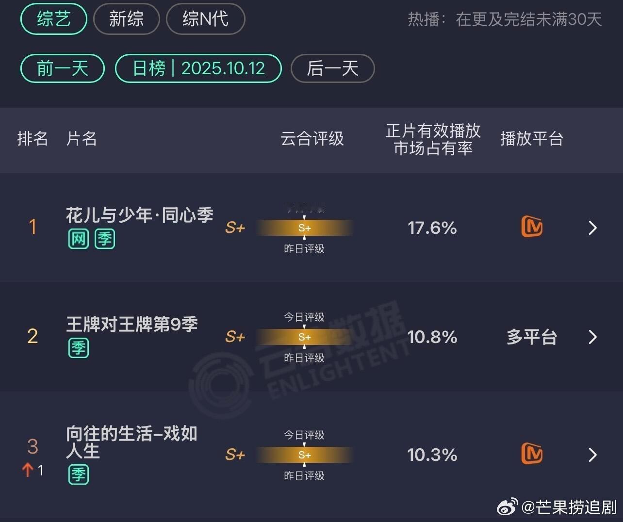 《花少7》第九集再次以17.6%的正片有效播放市场占有率登顶云合,同时第一期、第
