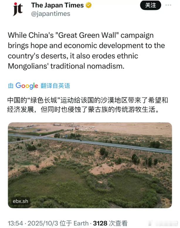美西方,又双叒叕耍不要脸,诋毁我国环保工程,特别是治沙成就了。这次,是美西方的走狗,日本一家媒体。该日本媒体公然诬蔑称中国治沙成就虽然给沙漠地区带来希望和经济发展,却侵蚀了蒙古族的传统游牧生活。首先呢,我国蒙古族同胞看到日本媒体这么说,应当直接对该日本媒体就开骂了......