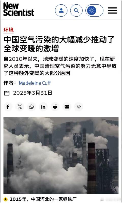 比如在今年3月,西方媒体就曾无耻的公然诬蔑称我国空气污染大幅减少恰恰推动了全球变暖激增,诋毁称我国让空气变好了却导致了地球额外的变暖,而且还是主要原因。美西方的意思太明显了,就是我国的空气越干净,那么地球就越变暖。按美西的这个逻辑, 那么如果我国的空气再干净一些,地球岂不是要变成火球了?